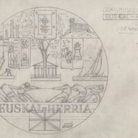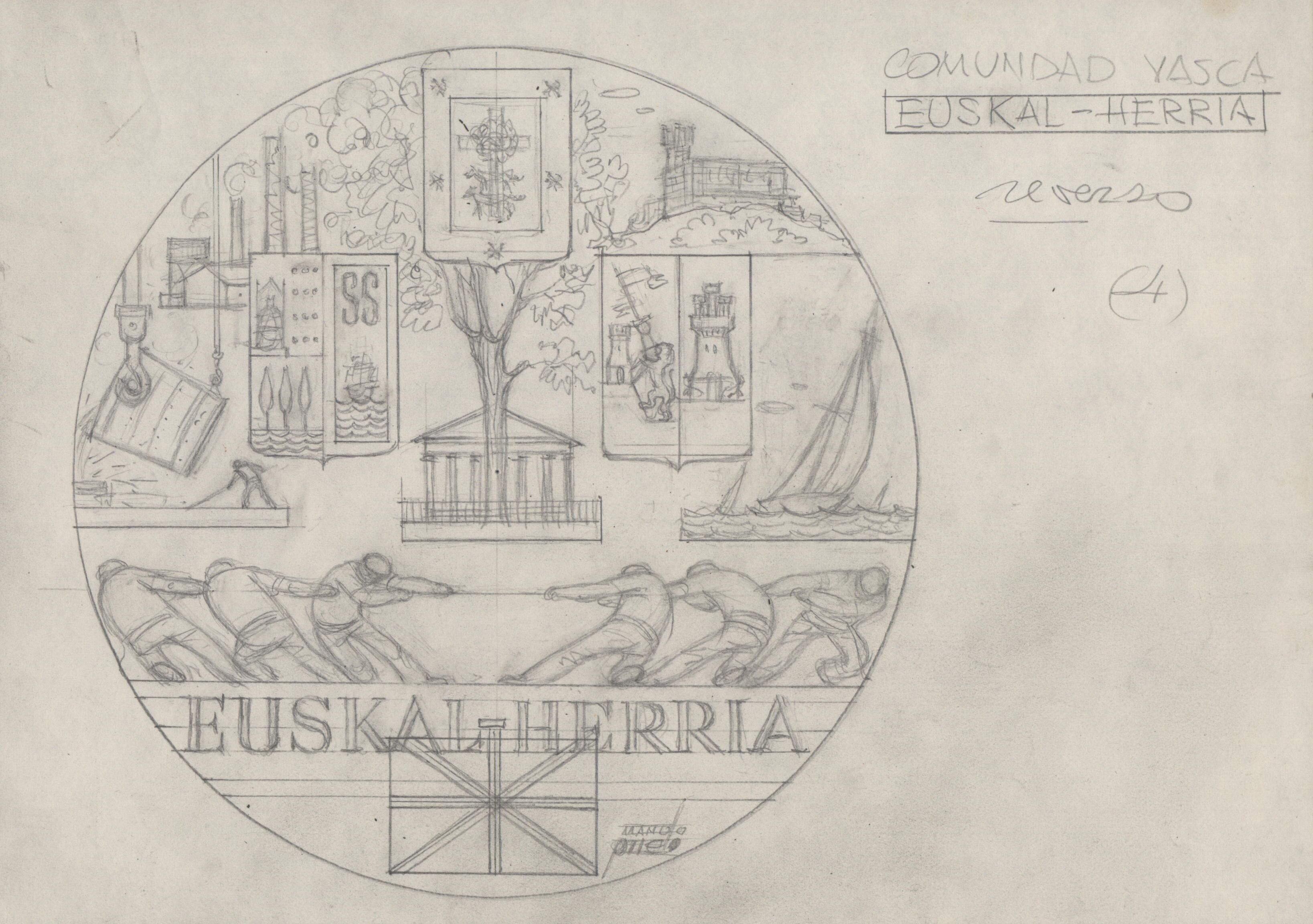 - Boceto a lápiz del reverso de la medalla de la Comunidad Vasca con elementos, personajes e imágenes característicos de la región: en el centro geométrico, el árbol de Guernika.