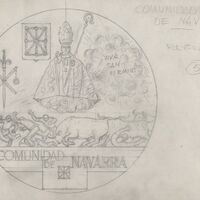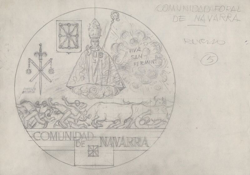 - Boceto a lápiz del reverso de la medalla de la Comunidad Navarra, en primer término un encierro de San Fermín y el famoso patrono, con imágenes y elementos característicos de la región.