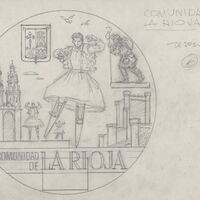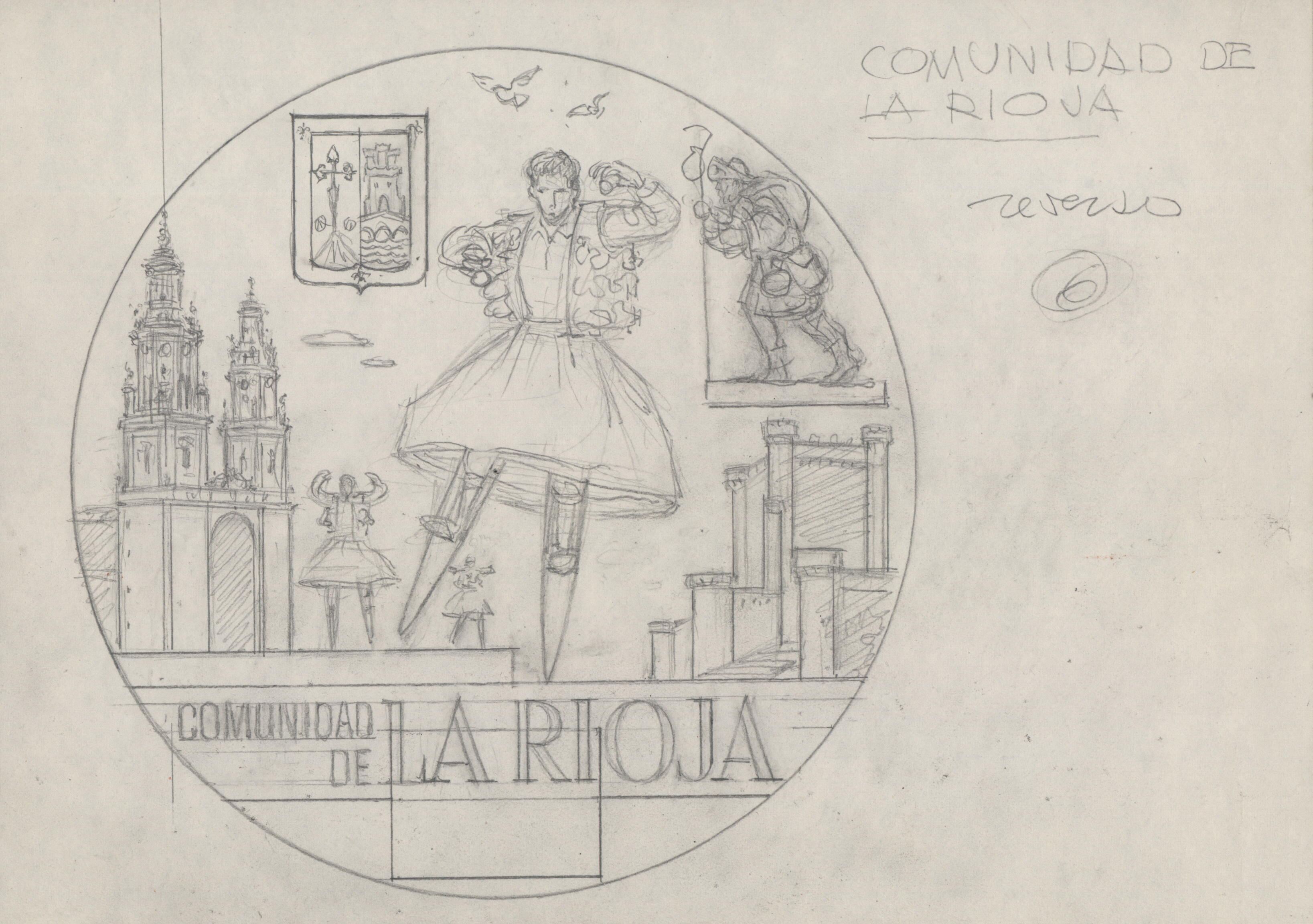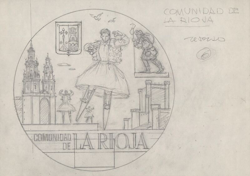 - Boceto a lápiz del reverso de la medalla conmemorativa de la Comunidad de La Rioja, con monumentos arquitectónicos elementos y bailes típicos de la región. En uno de los dibujos, un peregrino en el Camino de Santiago.