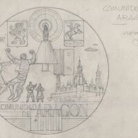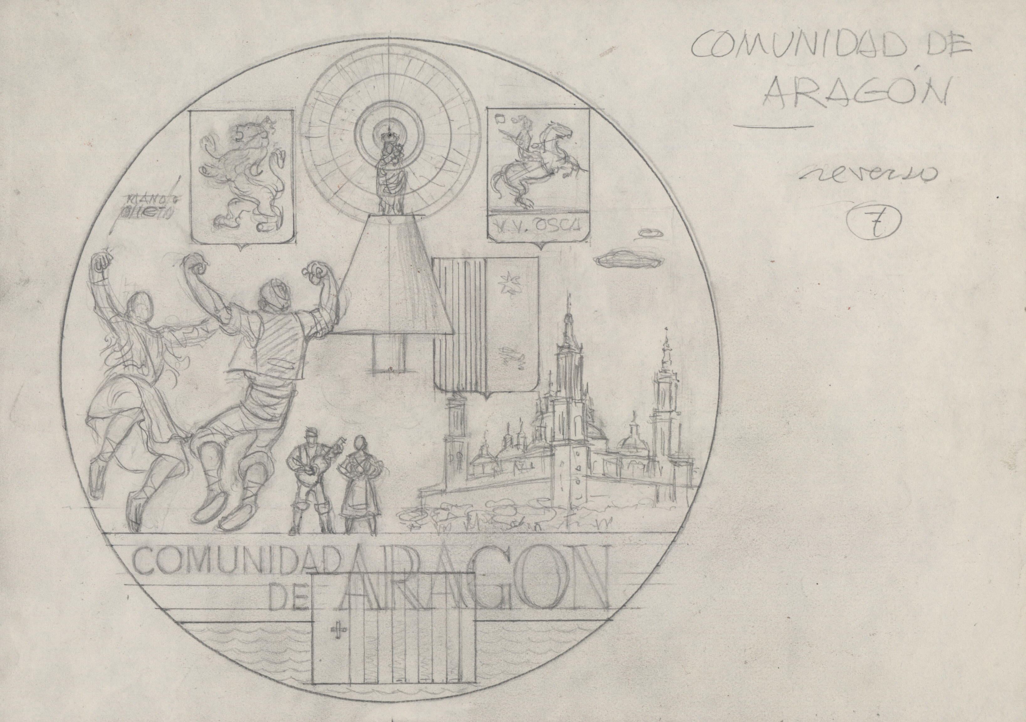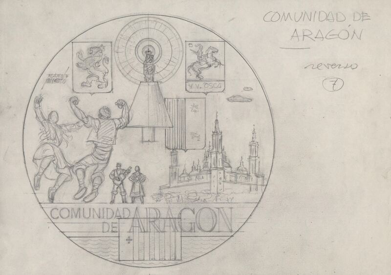 - Boceto a lápiz del reverso de la medalla conmemorativa de la Comunidad de Aragón, en primer término una pareja de maños bailando una junto a la Virgen del Pilar y la Basílica del Pilar de Zaragoza más elementos significativos de la región.