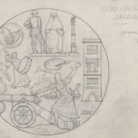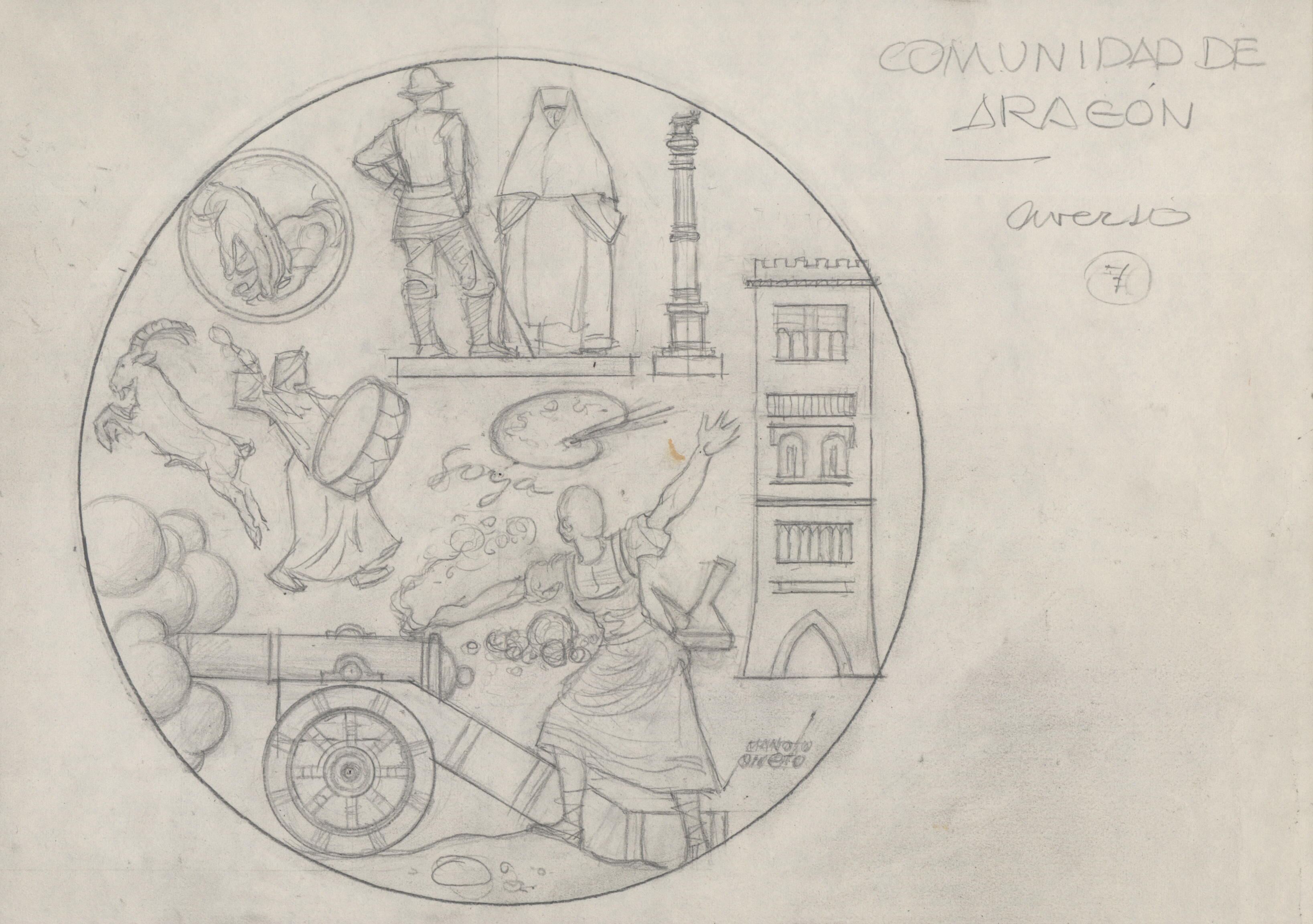 - Boceto a lápiz del anverso de la medalla de la Comunidad de Aragón. En primer término doña Agustina de Aragón junto a un cañón junto a elementos característicos de la región.