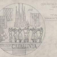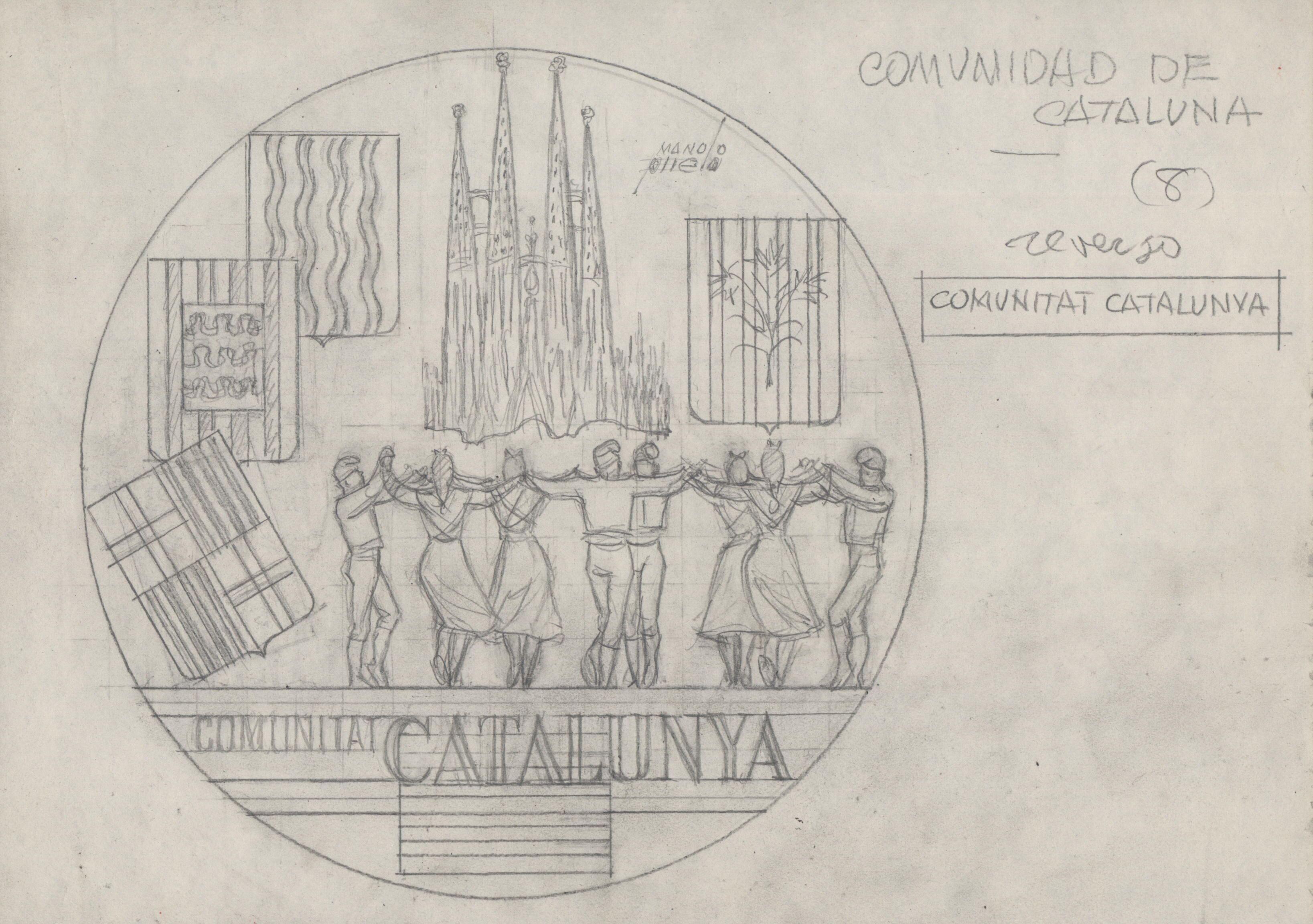 - Boceto a lápiz del reverso de la Comunidad Catalana con las silueta de la Catedral Barcelonesa de Gaudí, junto a un grupo de personas bailando una sardana, formando un corro y escudos de diferentes regiones de la comunidad.