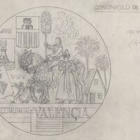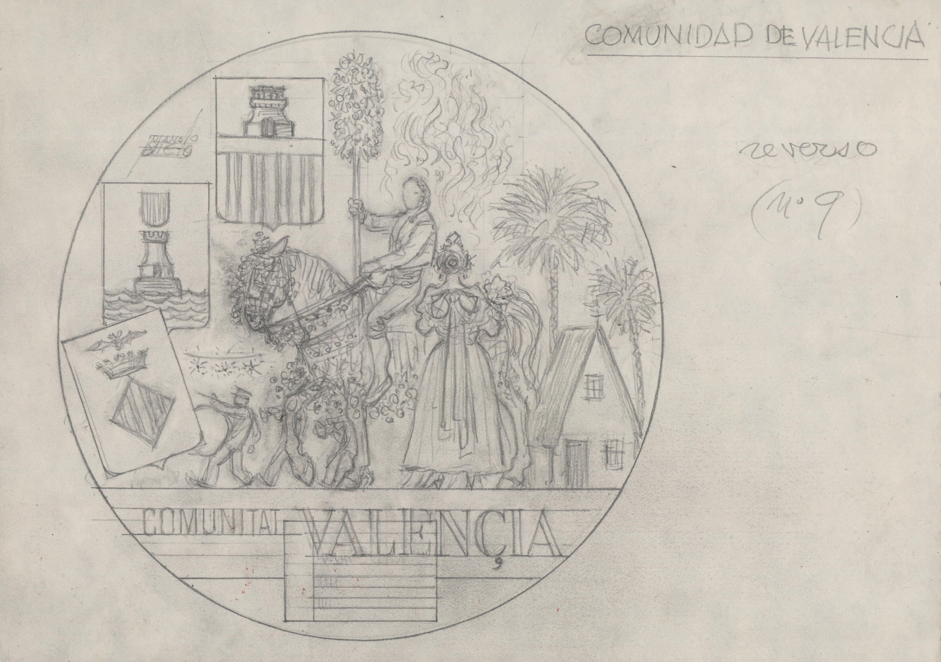 - Boceto a lápiz del reverso de la medalla conmemorativa de la Comunidad Valenciana con la figura en primer término de una fallera junto a un hombre a caballo junto a elementos significativos de la comunidad.