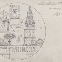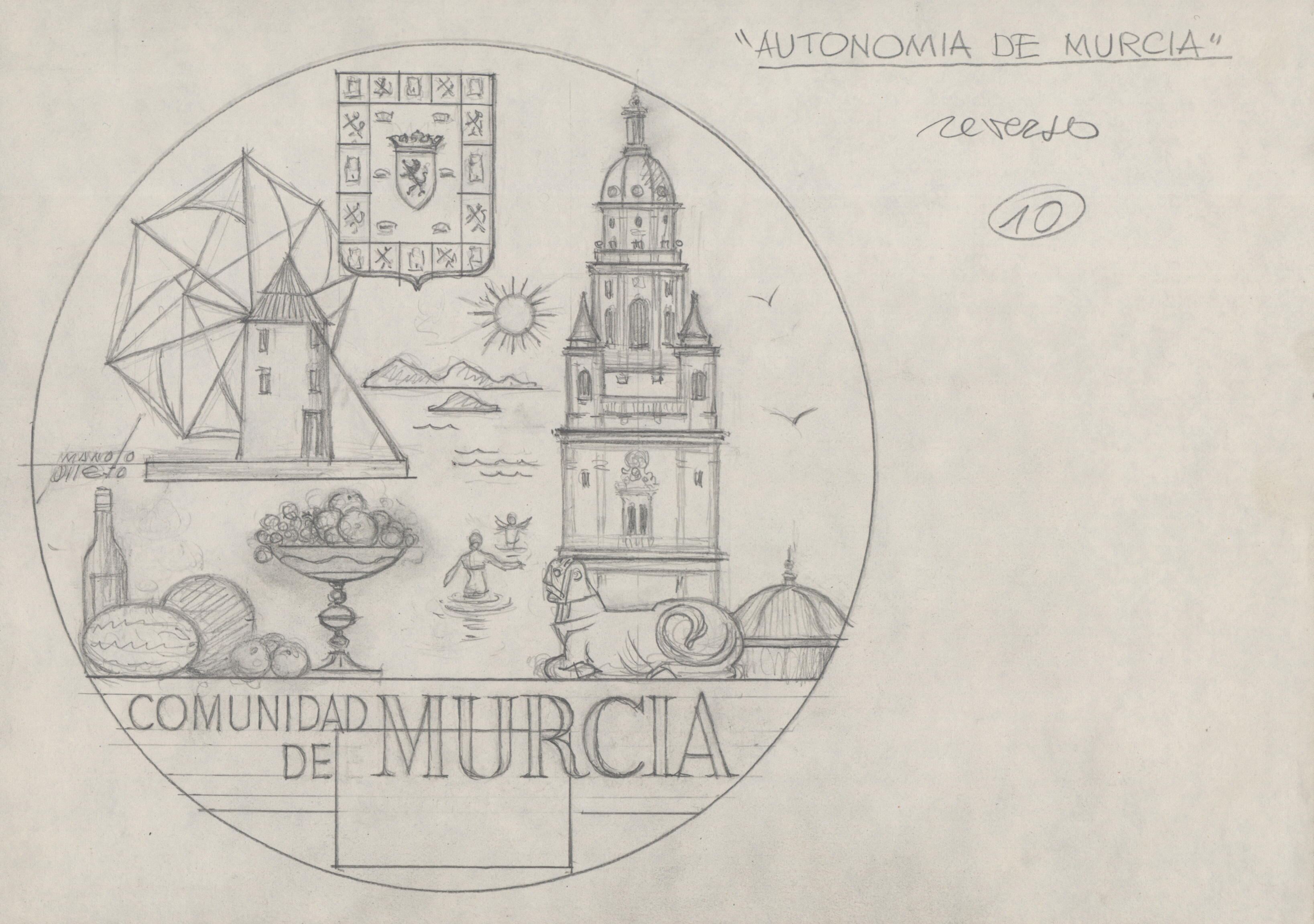 - Boceto a lápiz del reverso de la Autonomía Murciana, con elementos arquitectónicos y gastronómicos típicos de la región, como la torre de la Catedral o un joven adentrándose en el Mar menor.