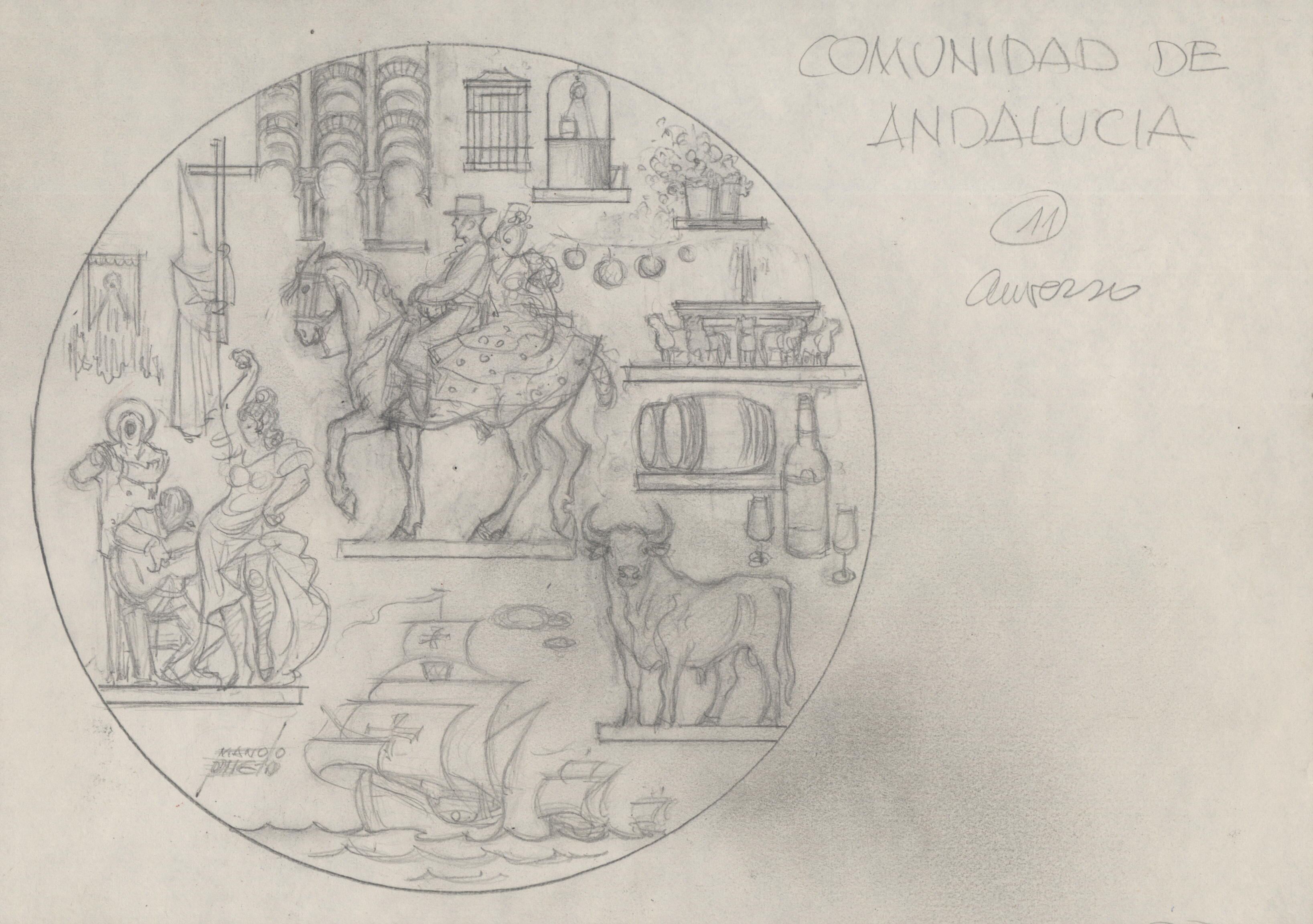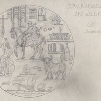 - Boceto a lápiz de la medalla conmemorativa de la Comunidad Andaluza, en cuyo centro una pareja vestidos con trajes típicos andaluces, a caballo, rodeado por elementos de la gastronomía significativos de la región.