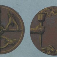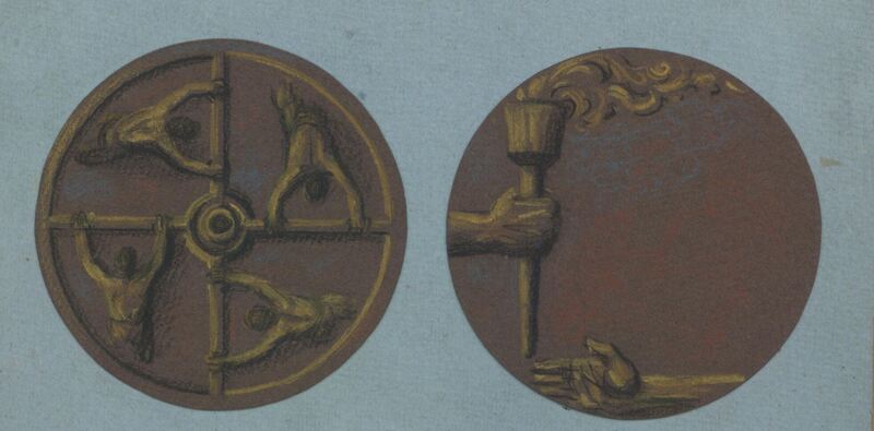 - Dibujo de dos medallas, la primera de ellas con la escena vista desde arriba de cuatro hombres moviendo una estructura de madera de cuatro mástiles unidos por una pieza circular que las hace girar, la segunda medalla la imagen del brazo de un hombre que porta una antorcha y otra mano que intenta cogerla en el relevo.