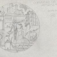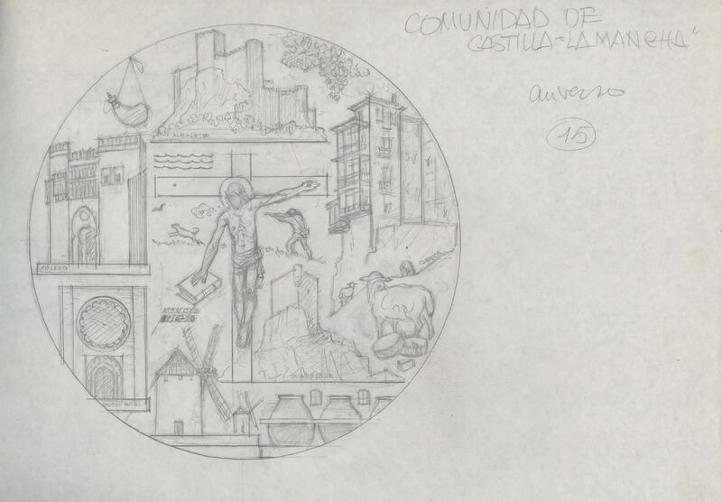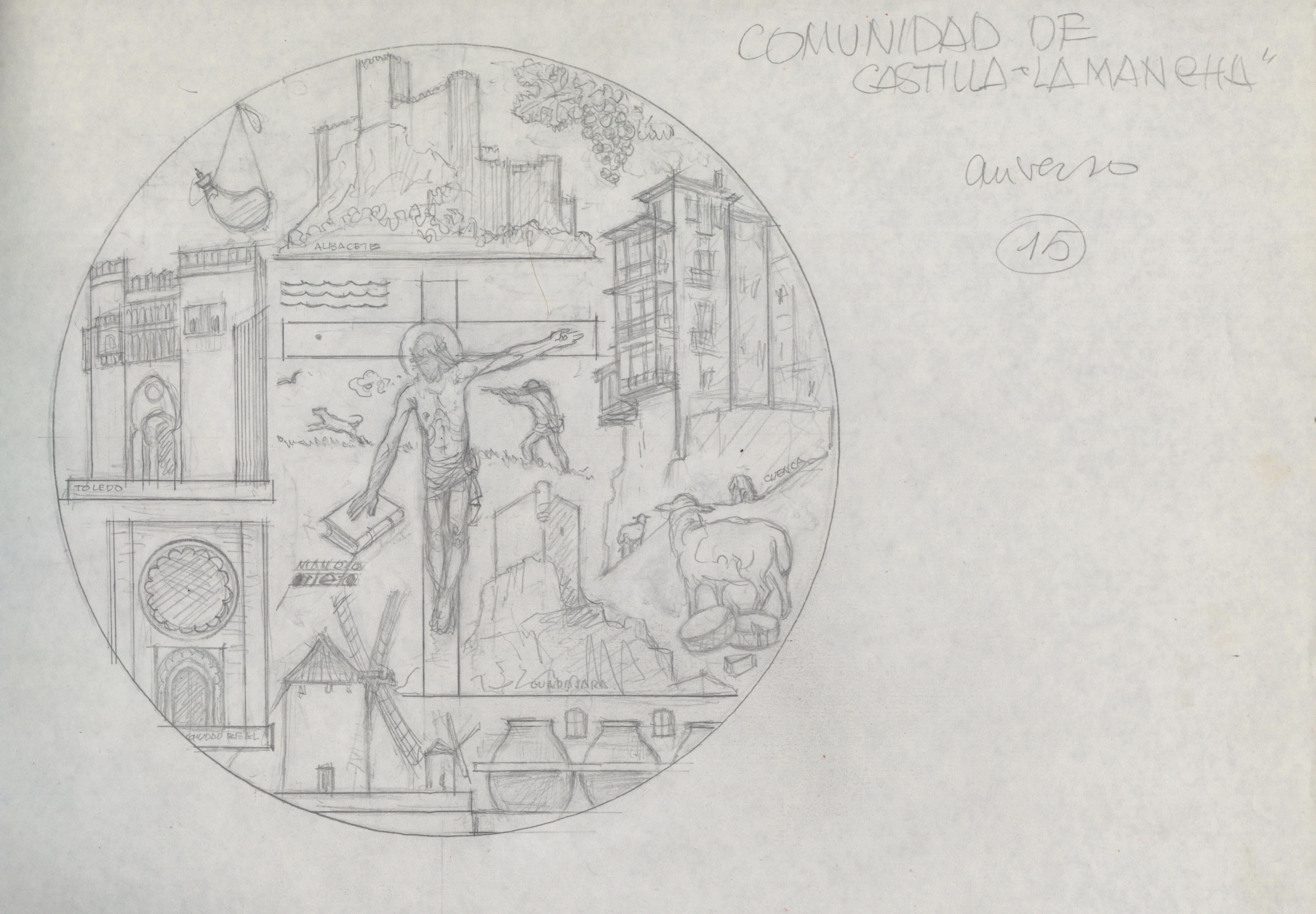 - Boceto a lápiz del anverso de la medalla conmemorativa de la Comunidad de Castilla La Mancha, con las imágenes de molinos de viento, las casas colgantes de Cuenca y elementos significativos de la comunidad.