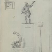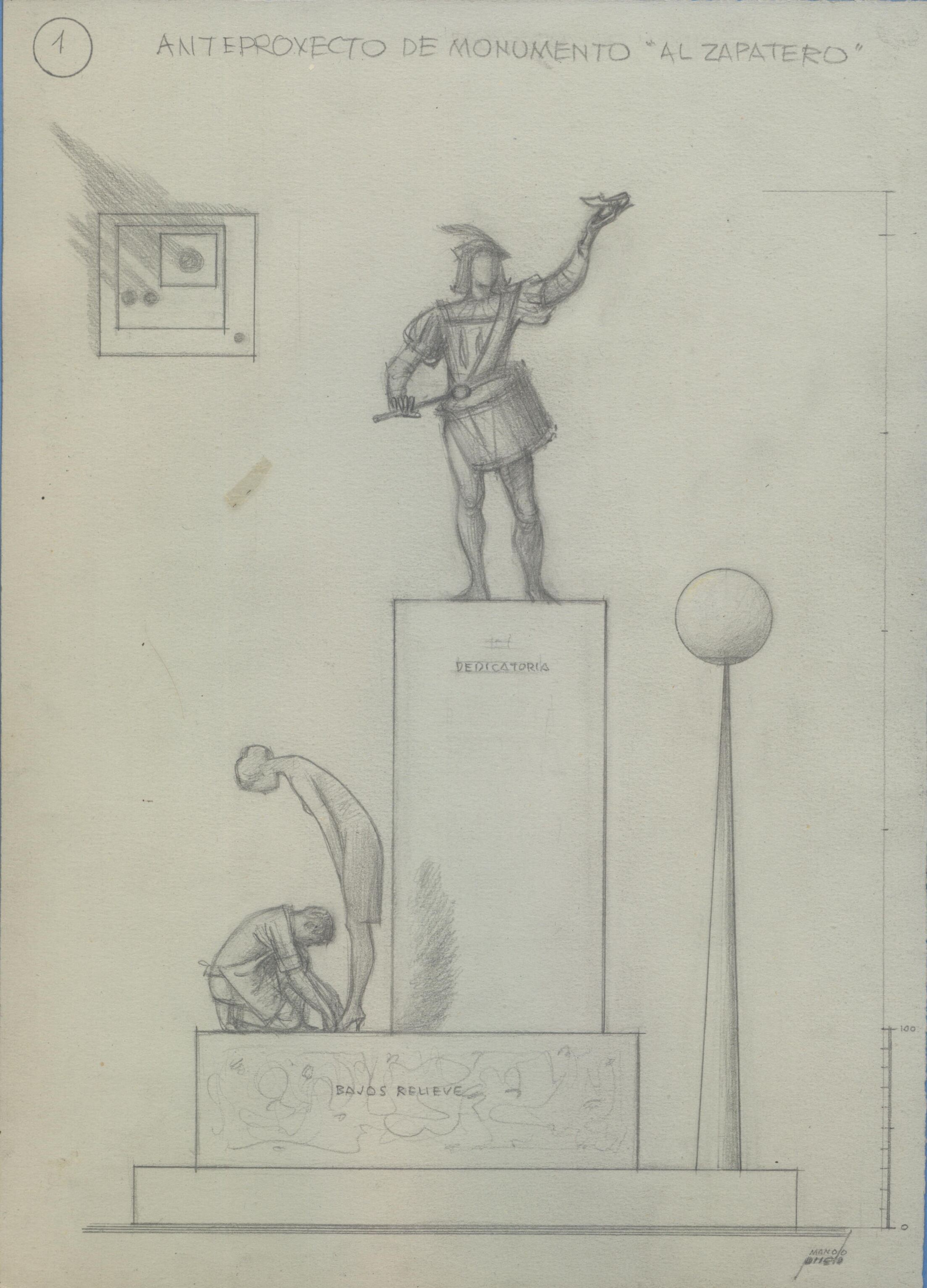 - Boceto a lápiz de un anteproyecto al monumento al zapatero, en cuya peana principal se levanta la figura de un caballero de época con un tambor y en su mano sostiene un zapato, junto a la imagen de una mujer que observa como un zapatero coge medidas de sus zapatos.
