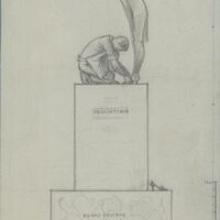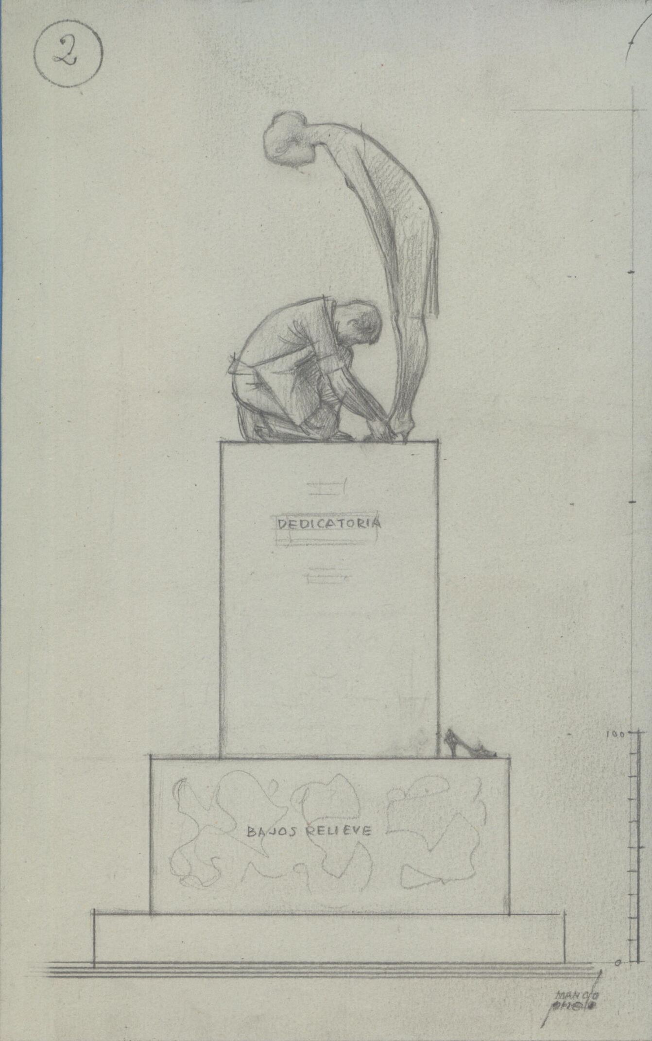 - Boceto a lápiz del proyecto a un monumento al zapatero donde de un pedestal de cierta altura se erige la figura de una mujer a la que le toman mediadas de sus zapatos un zapatero.