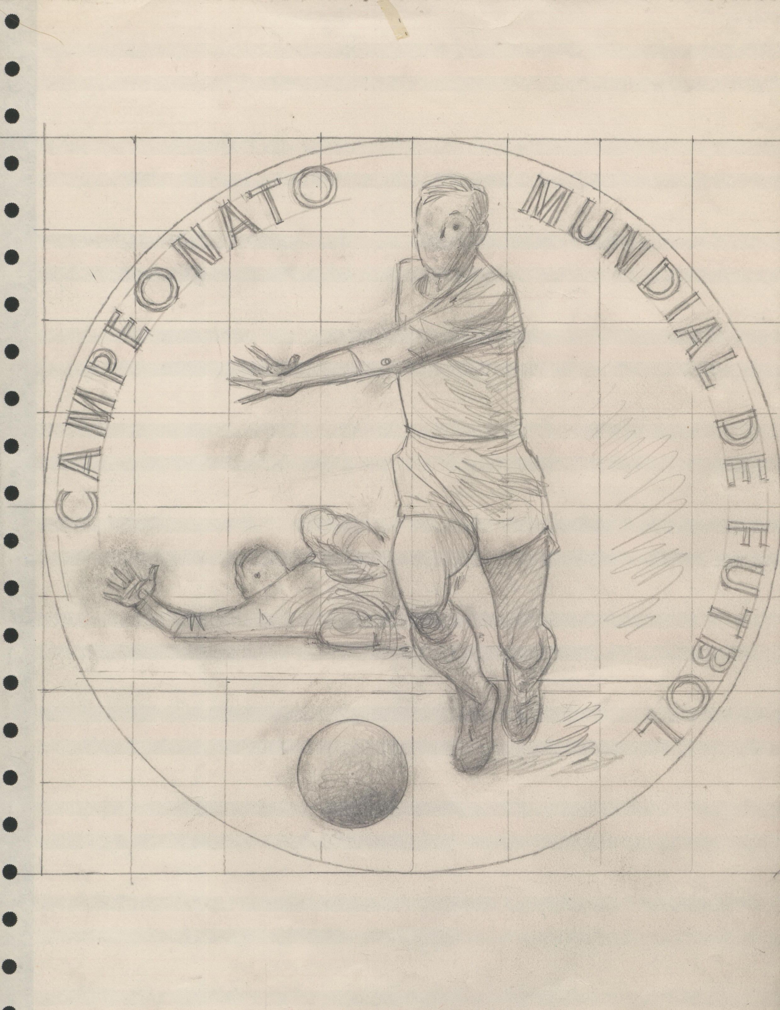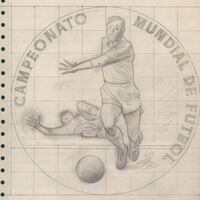 - Boceto a lápiz sobre fondo cuadriculado de una de las caras de una medalla representativa del campeonato mundial de fútbol, donde en primer término se observa a un jugador avanzando con la pelota mientras uno de sus rivales está tendido en el campo de juego.