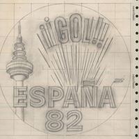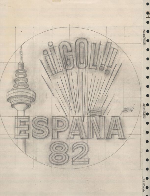 - Boceto a lápiz sobre fondo cuadriculado de una de las caras de una medalla representativa del campeonato mundial de fútbol celebrado el año 82, con las letras en grande de la palabra gol junto a las letras España 82 y de fondo el dibujo del Pirulí edifico de Torre España en Madrid.
