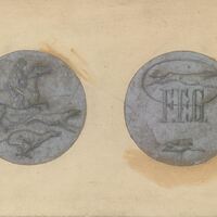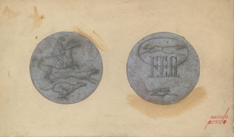 - Bocetos de las caras de una medalla, con la figura de un jinete a caballo galopando junto a una pareja de perros, y las siglas FEG con la imagen de un perro rodeado por una elipse.