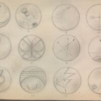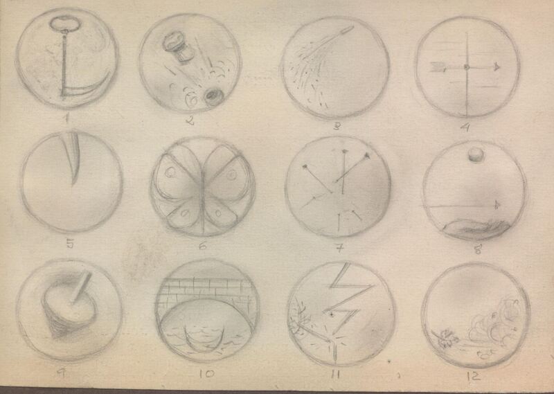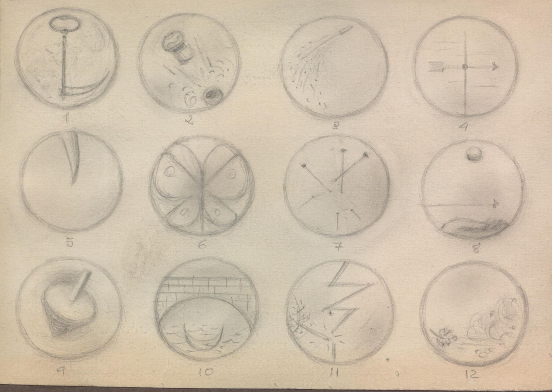 - Boceto a lápiz, de la composición lineal de doce medallas que representan diferentes temas no relacionadas entre sí. Es posible que se trate simbólicamente de los reversos de las medallas taurinas que hemos ido viendo.