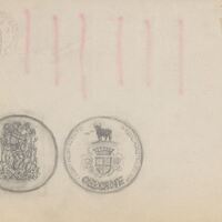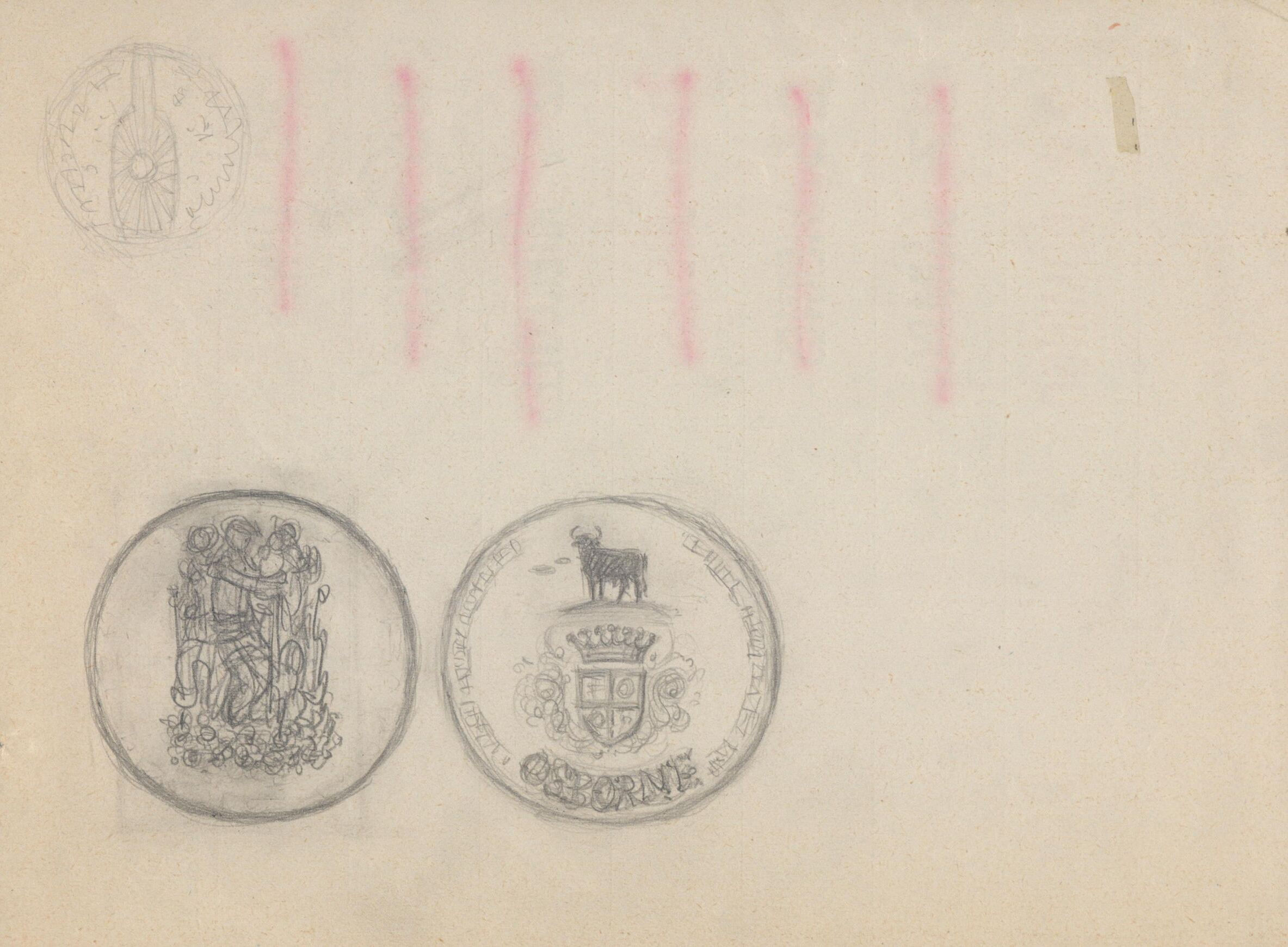 - Boceto a lápiz de las caras de una medalla representativa de las Bodegas Osborne, en una de ellas la silueta del toro encima de un escudo y a su lado un primer boceto difícil de identificar por la confusión de trazos.