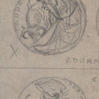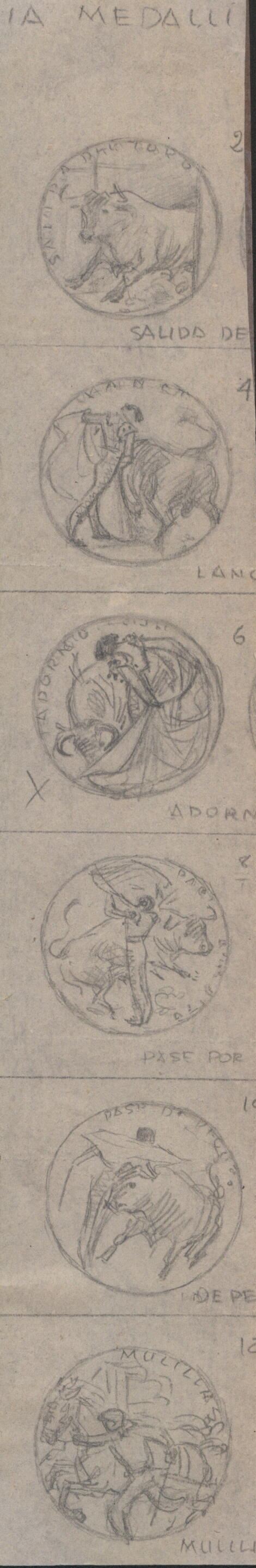 - Tira de una serie de bocetos a lápiz de unas medallas que representan escenas relacionadas con el toro y la fiesta taurina. Todas ellas son dibujos preparatorios en un primer momento del proceso creativo.