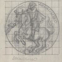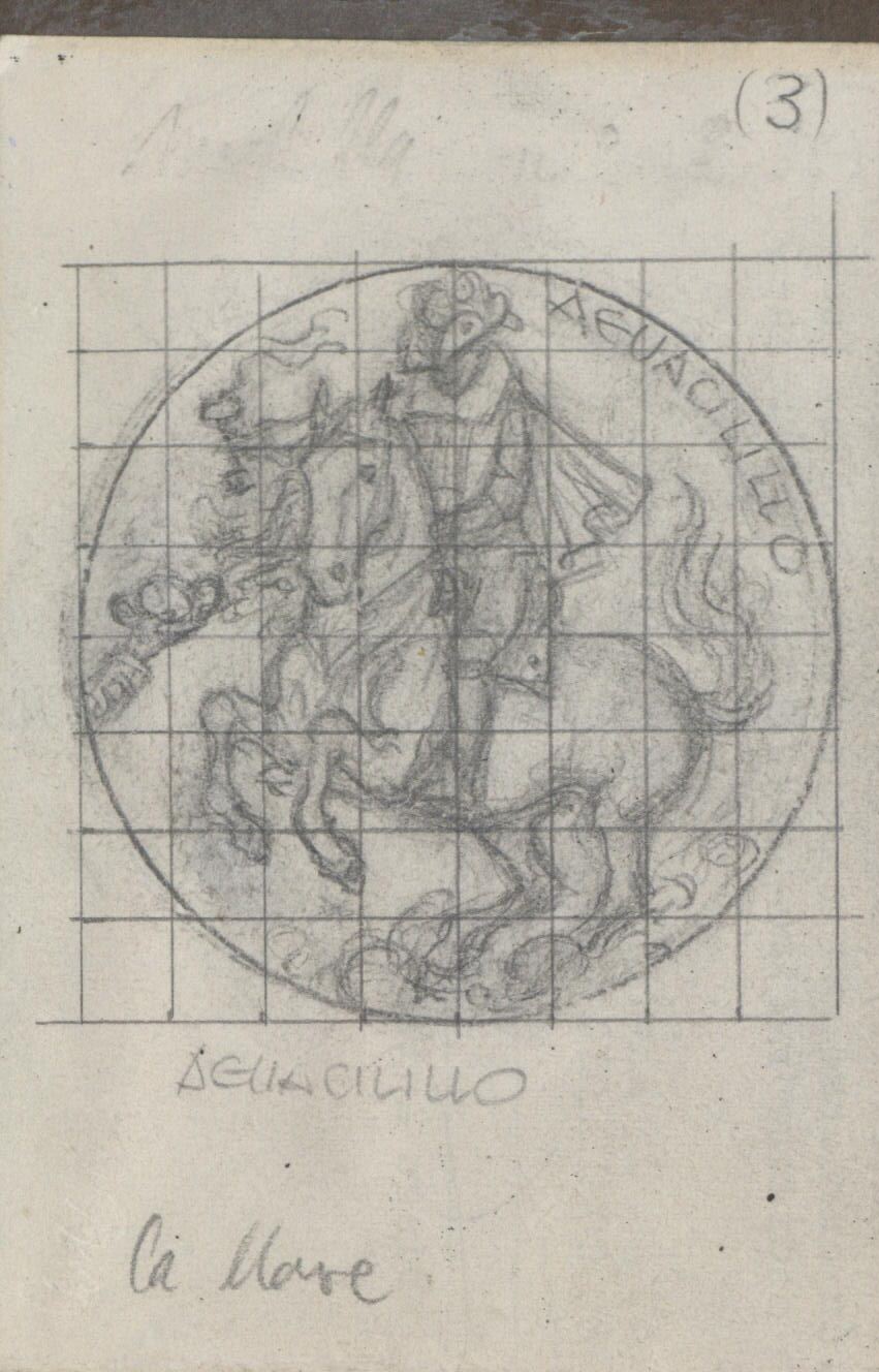- Boceto a lápiz con fondo cuadriculado, de la figura de un alguacil (“alguacilillo”, le llama oportunamente el artista) a caballo, sujetando en una de sus manos una llave, con apuntes a lápiz del título y la numeración: “(3)”.