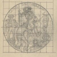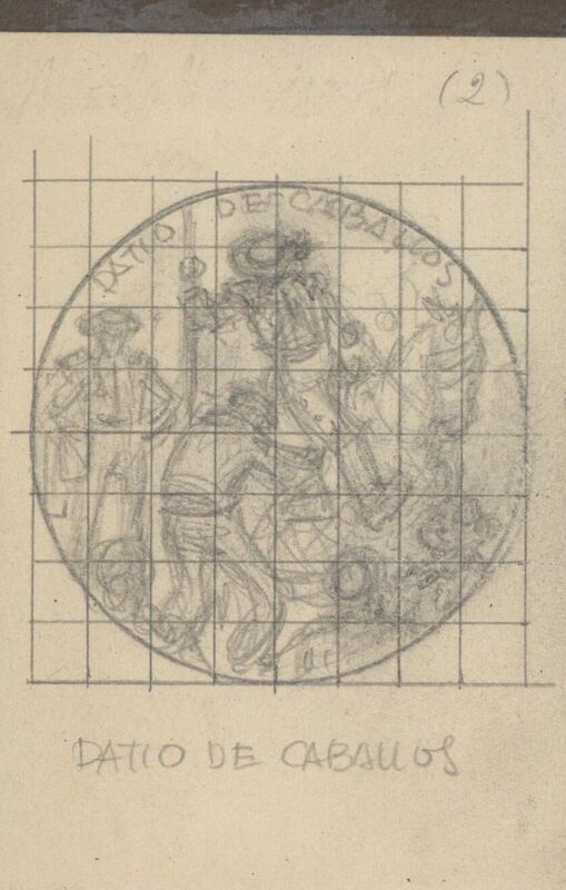 - Boceto a lápiz, con fondo cuadriculado, con la escena un tanto cargada de un picador en su caballo y la figura de otros personajes a su alrededor, con apuntes a lápiz del título y la numeración: “(2)”.