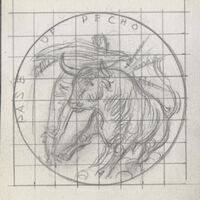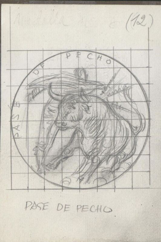 - Boceto a lápiz del pase de pecho del torero, con apuntes a lápiz hechos por el artista acerca del título y la numeración: “(12)”. El que esté cuadriculado nos habla del que una posible transposición a otra dimensión o material.