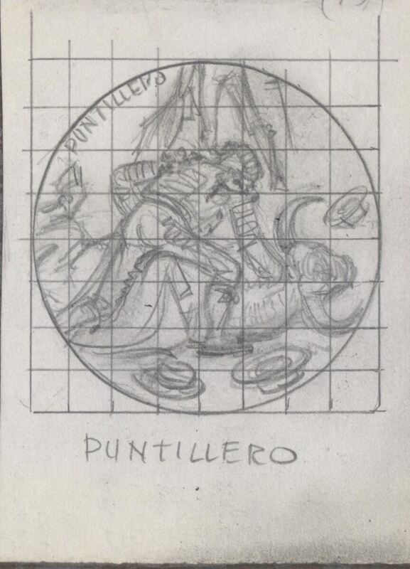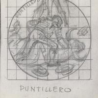 - Boceto a lápiz con fondo cuadriculado, de un de los subalternos de la cuadrilla, de espaldas al espectador, apuntillando al toro derribado sobre el ruedo. El título está apuntado abajo, también con lápiz.