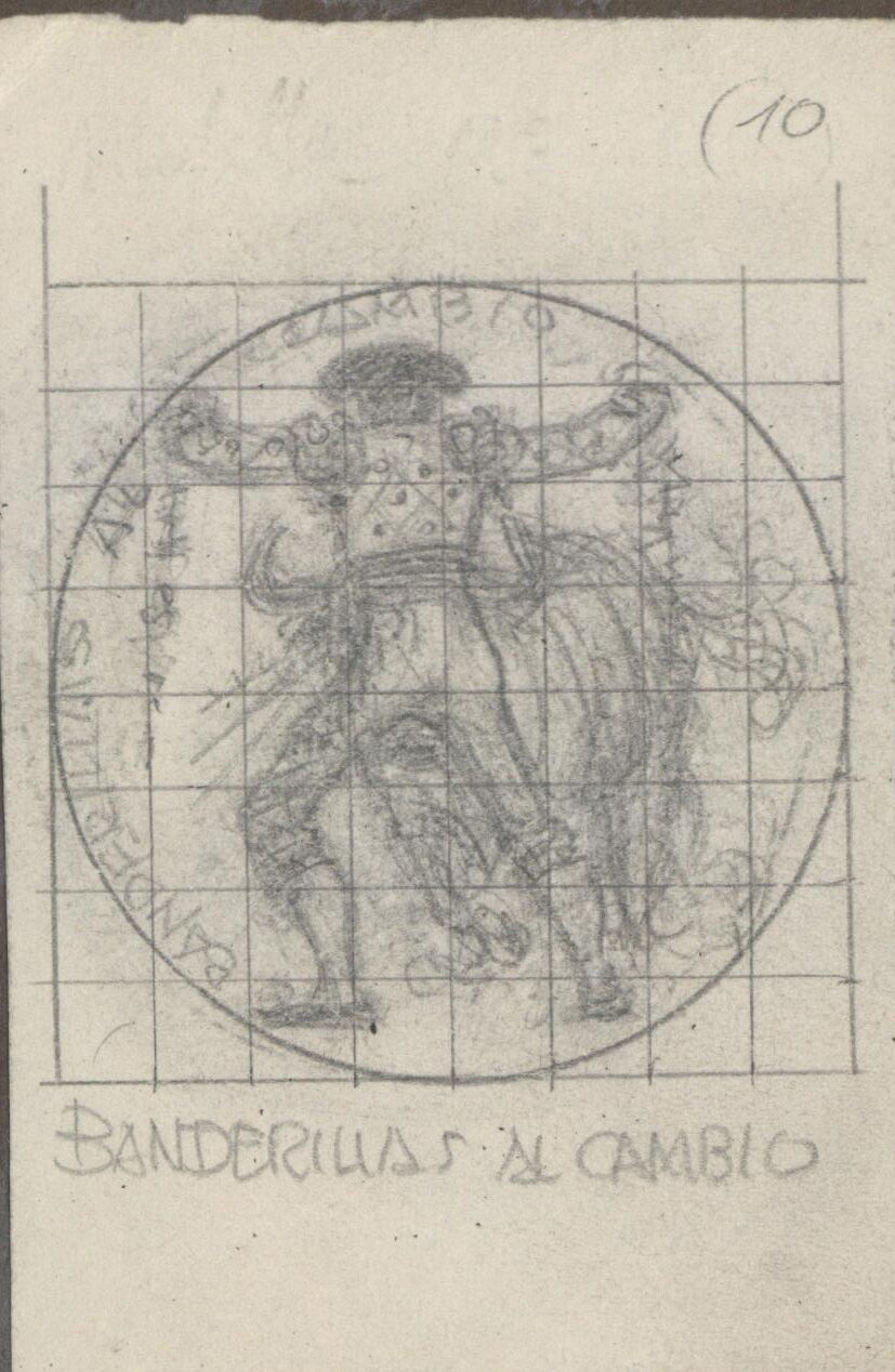 - Boceto muy repetido en su obra, realizado a lápiz con fondo cuadriculado, de un banderillero de espaldas frente al toro con los brazos en alto con dos banderillas, con apuntes a lápiz del título y la numeración: “(10)”.