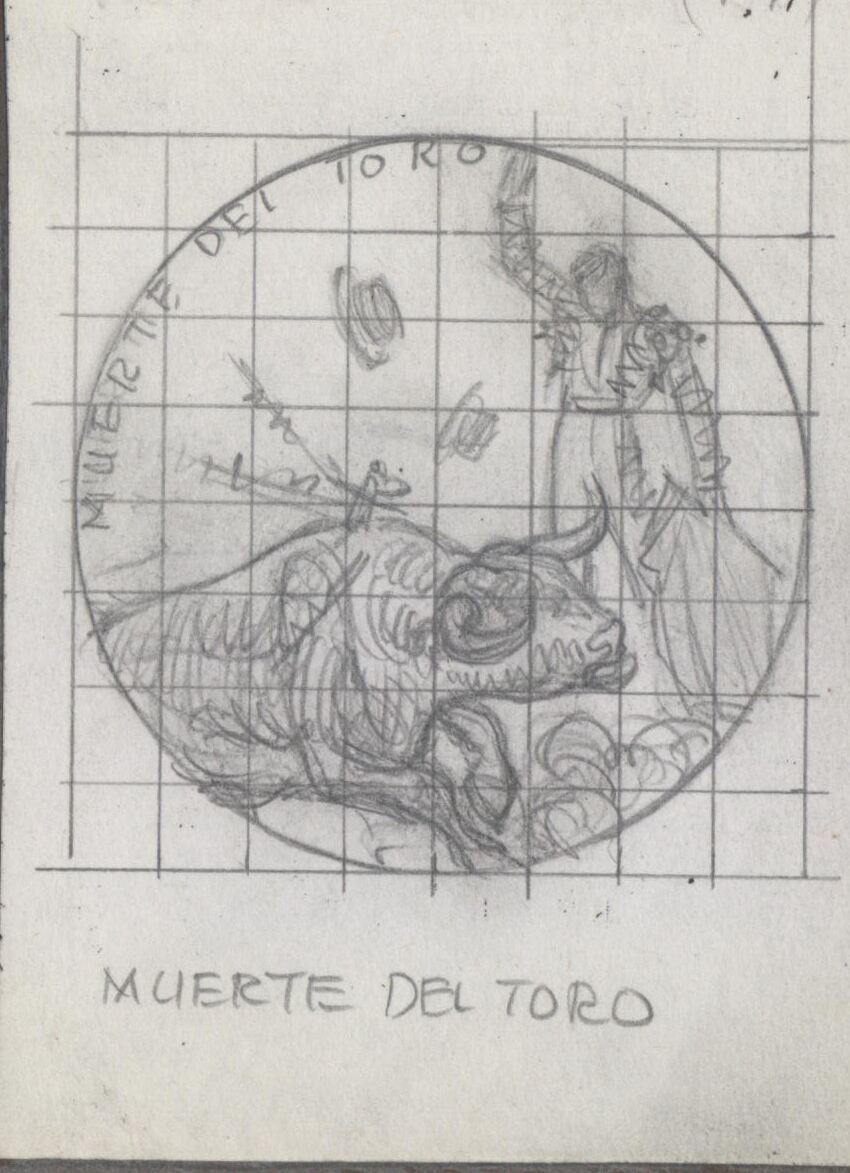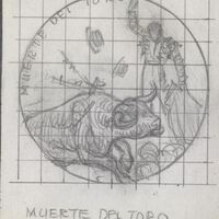 - Boceto a lápiz con fondo cuadriculado, de la imagen de un torero frente al toro que cae desplomado a la arena del ruedo con apuntes a lápiz del título. Los sombreros tirados al ruedo nos hablan del éxito de la faena.