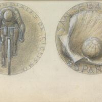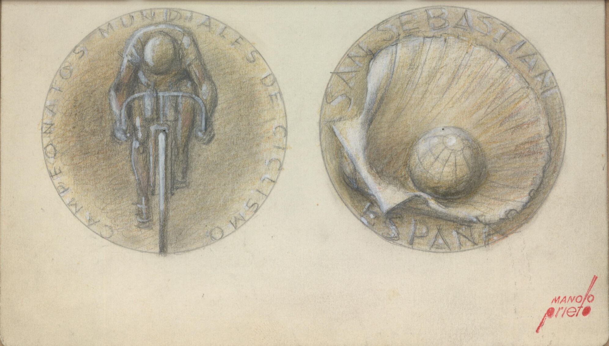 - En el anverso de la medalla la imagen central de un ciclista con su bici rodeado por las letras campeonatos mundiales de ciclismo, en el reverso una gran concha símbolo de Donostia en cuyo interior la imagen de una esfera terrestre rodeado por las letras San Sebastián, España.