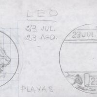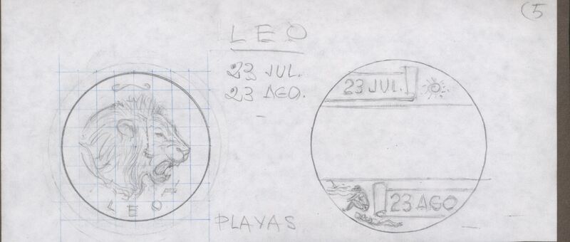 - Boceto a lápiz de dos caras de unas medallas con diferentes temas pero mismo significado en la relación de fechas, la primera con la imagen de un león símbolo de un signo del zodiaco, y la otra con las dos fechas correspondientes a la época vacacional que corresponde a las del zodiaco representado.