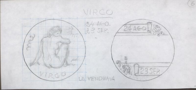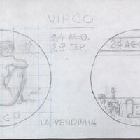- Boceto a lápiz de dos caras de unas medallas con diferentes temas pero mismo significado en la relación de fechas, la primera con la imagen de una mujer de espaldas desnuda como un signo del zodiaco, y la otra con las dos fechas correspondientes a la época de la vendimia que corresponden con las del zodiaco.