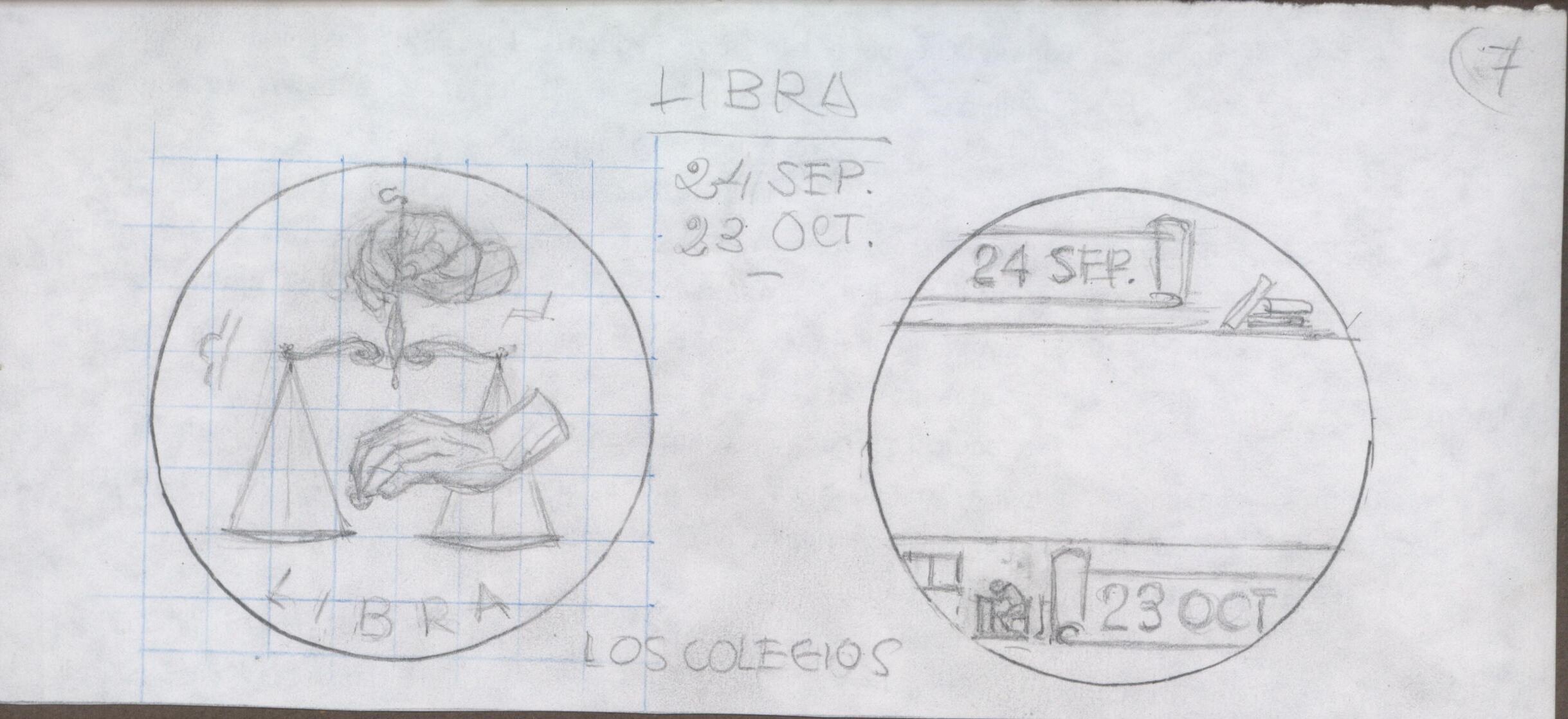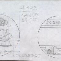 - Boceto a lápiz de dos caras de unas medallas con diferentes temas pero mismo significado en la relación de fechas, la primera con la imagen de una balanza símbolo del equilibrio y del signo del zodiaco representado, junto a las dos fechas correspondientes con el inicio del comienzo de los colegios.