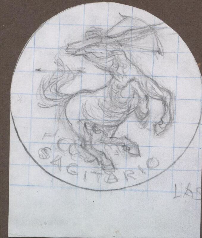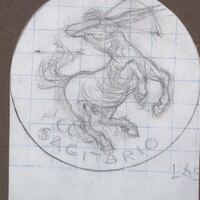 - Boceto a lápiz con fondo de cuadrículas (da la sensación de que el dibujo se hizo en un papel de cuaderno cuadriculado), de la imagen representativa del signo del zodiaco sagitario, de un centauro mitad hombre mitad caballo tirando al arco.
