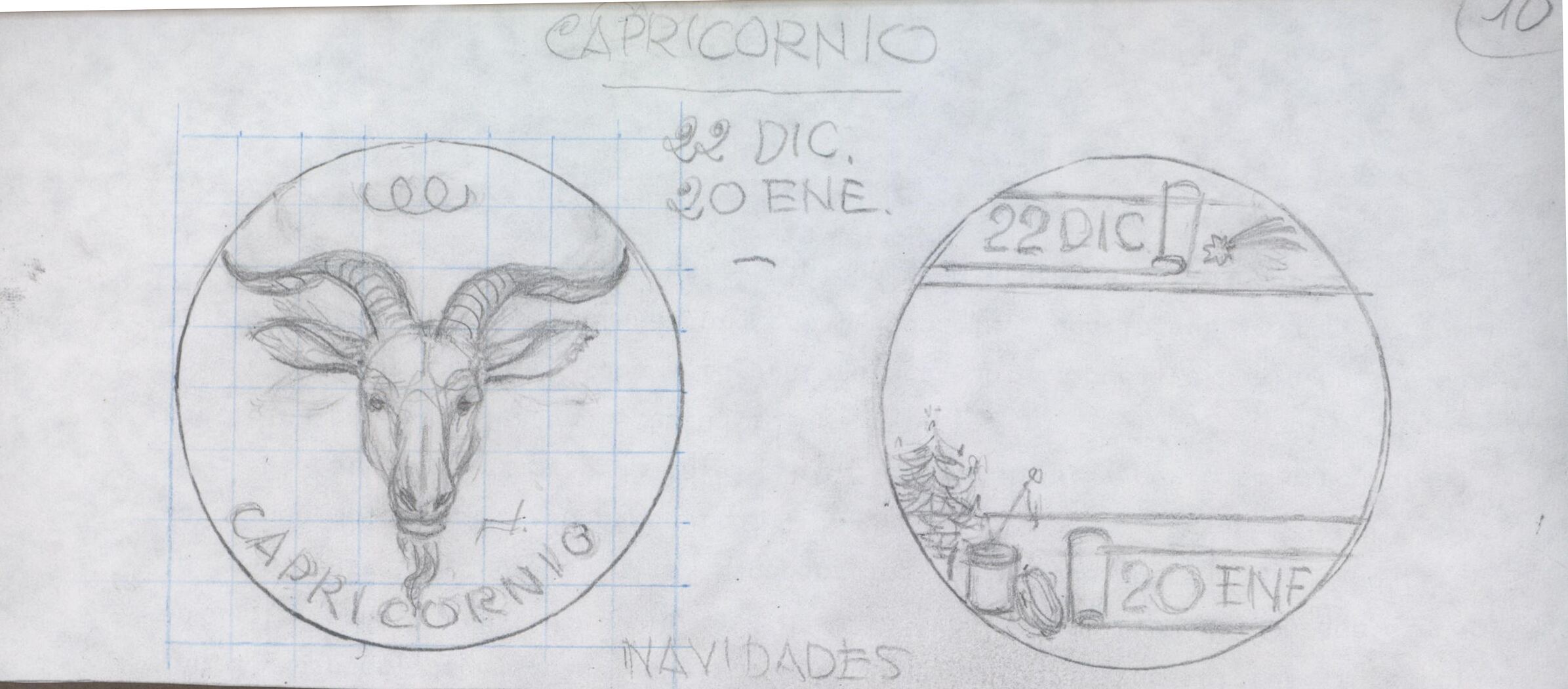 - Boceto a lápiz de dos caras de unas medallas con diferentes temas pero mismo significado en la relación de fechas, la primera con la imagen de un cabrito junto a las dos fechas correspondientes a las navidades.