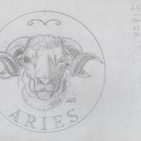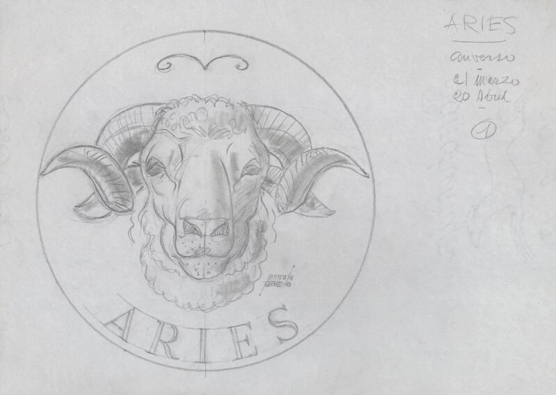 - Boceto a lápiz de una medalla con la cara de un cabrito de grandes cuernos símbolo del signo del zodiaco representado. El dibujo resulta, por su realismo y su fuerza, de una extraordinaria calidad.