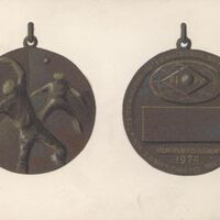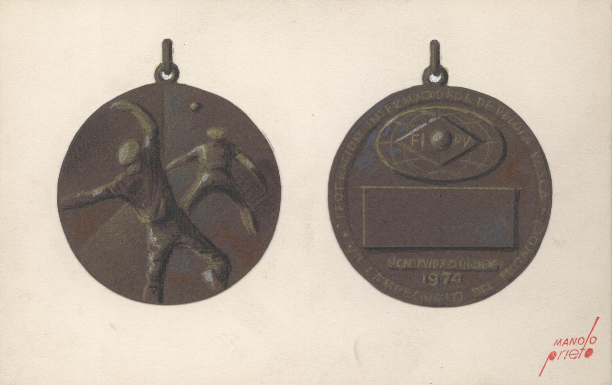 - En el anverso la imagen de dos hombres jugando a la pelota vasca, y el reverso rodeando la medalla letras inscritas en el centro un rectángulo en relieve debajo Montevideo- Uruguay 1974.
