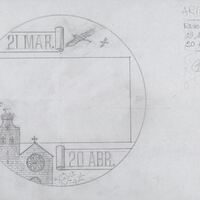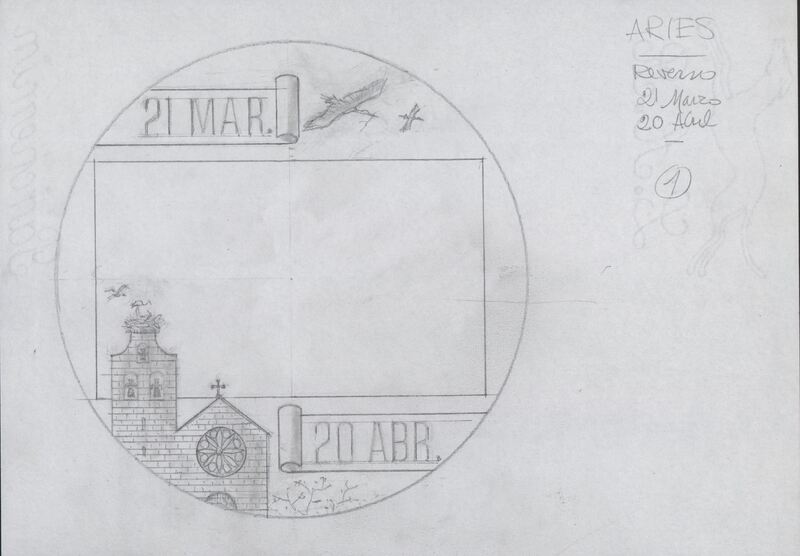- Boceto a lápiz de una medalla con las fechas correspondientes signo del zodiaco con la imagen de las torres de dos edificios, uno de ellos una iglesia, asociando esos meses con la llegada de las cigüeñas.
