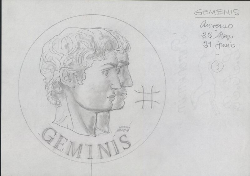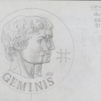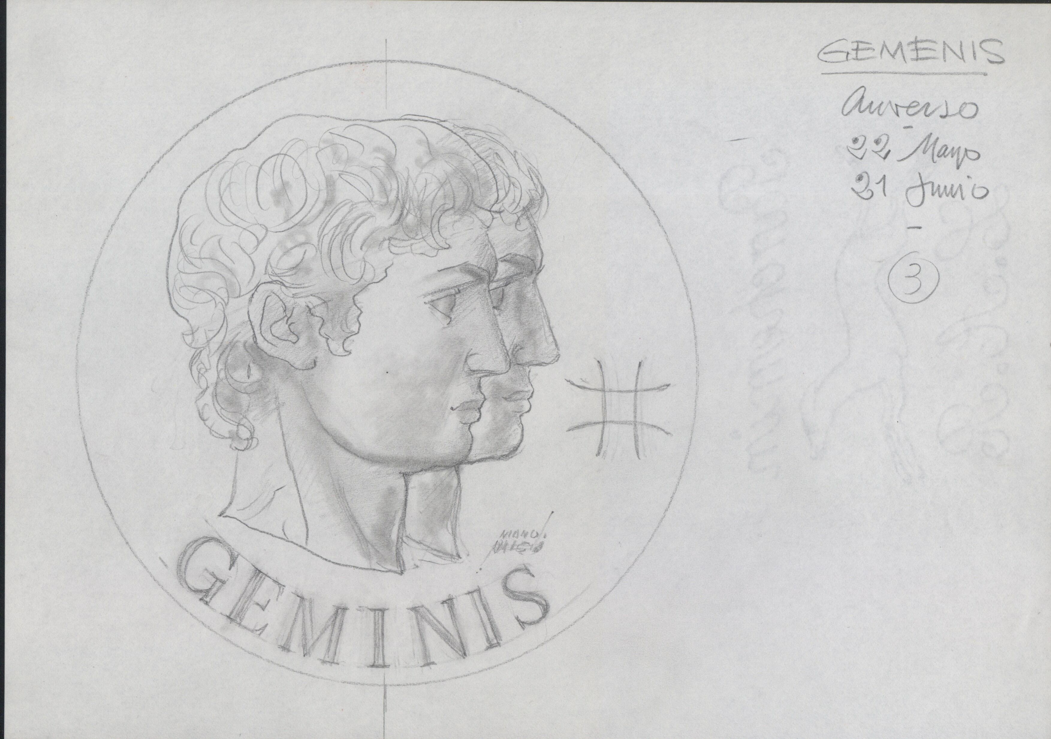 - Boceto a lápiz del anverso de la medalla correspondiente al signo géminis, representado por la composición de perfil de dos retratos masculinos de rasgos equilibrados del mundo griego, junto a la medalla anotaciones a lápiz del autor.