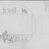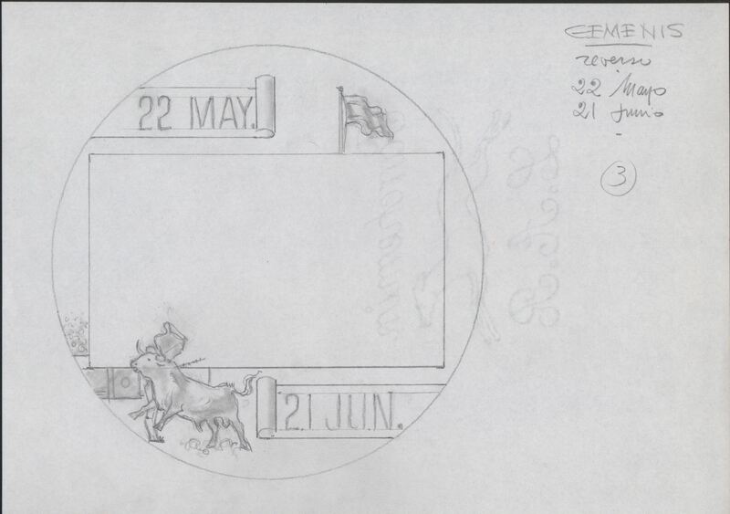 - Boceto a lápiz del reverso de la medalla correspondiente al signo géminis, con las fechas correspondientes al signo y la imagen de un toro en una de las esquinas inferiores, junto a la medalla anotaciones a lápiz del autor.