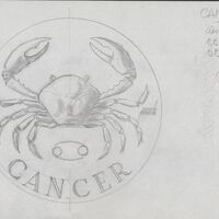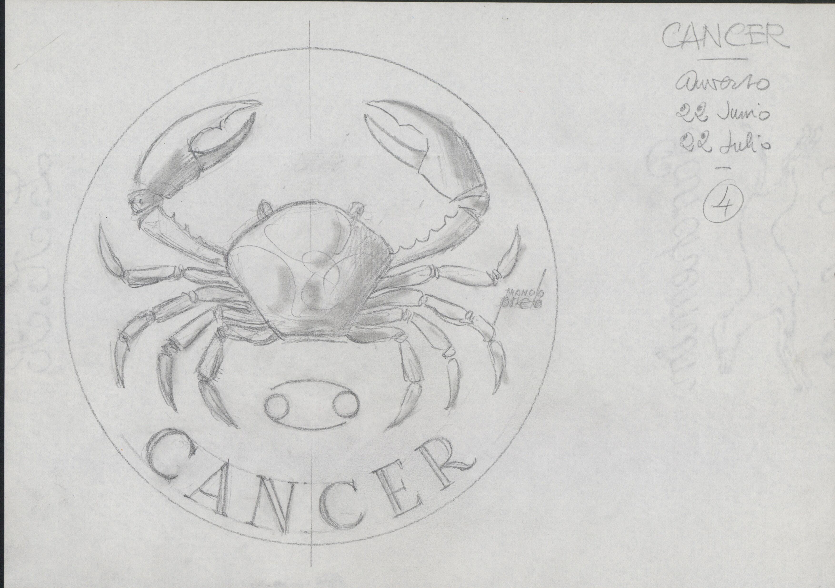 - Boceto a lápiz del anverso de la medalla correspondiente al signo cáncer, representado por la imagen de un cangrejo, junto a la medalla anotaciones a lápiz del autor. La imagen tiene una extraordinaria fuerza.