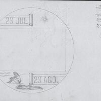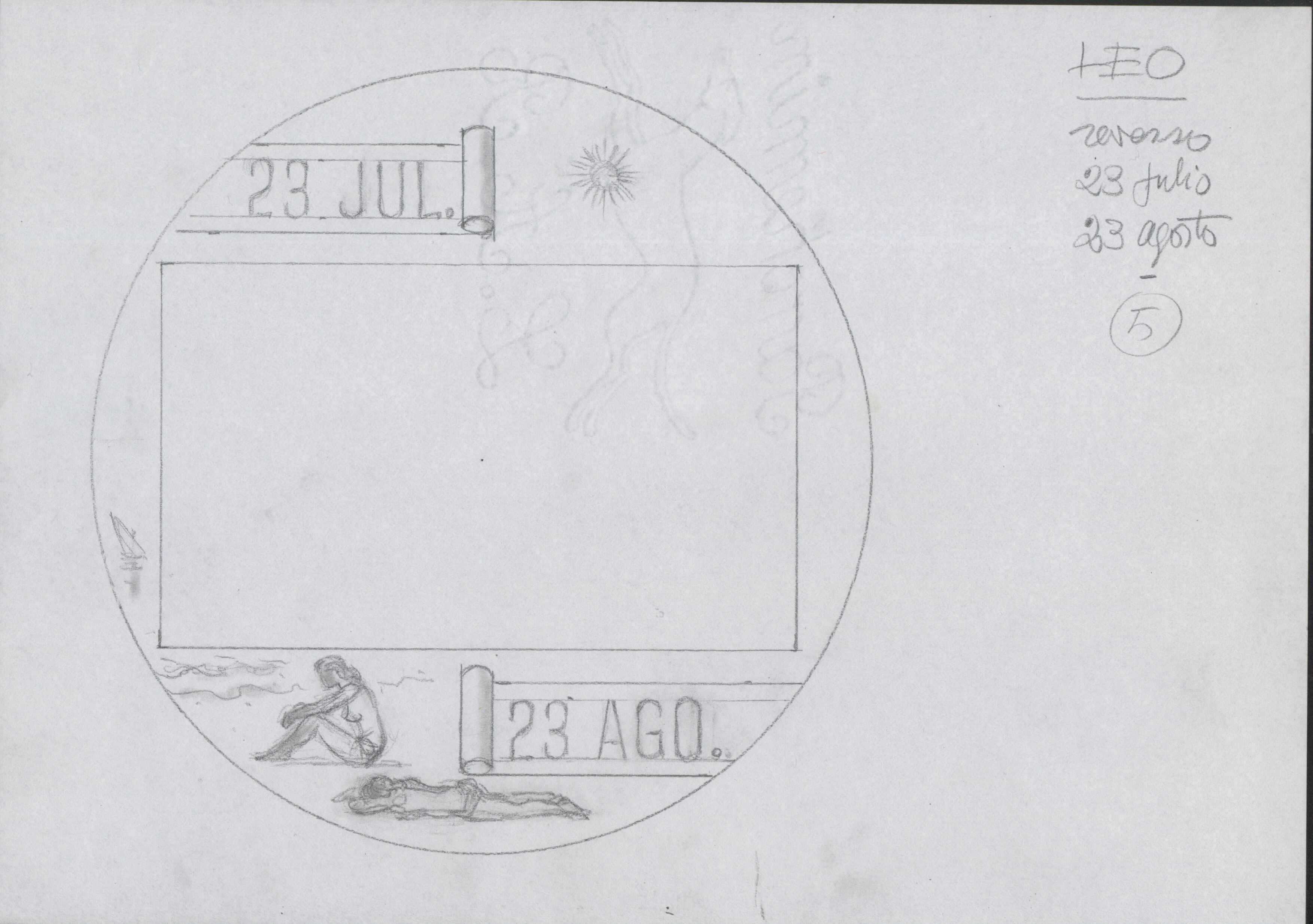 - Boceto a lápiz del reverso de la medalla correspondiente al signo Leo, con las fechas correspondientes al signo y la imagen de dos mujeres en la playa tomando el sol junto a la medalla anotaciones a lápiz del autor.