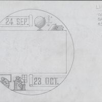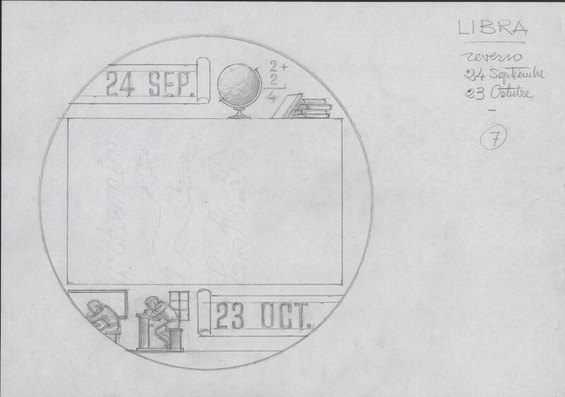 - Boceto a lápiz del reverso de la medalla correspondiente al signo libra, con las fechas correspondientes al signo y la imagen de un niño apoyado sobre la tapadera de su pupitre en la vuelta al colegio junto a la medalla anotaciones a lápiz del autor.