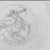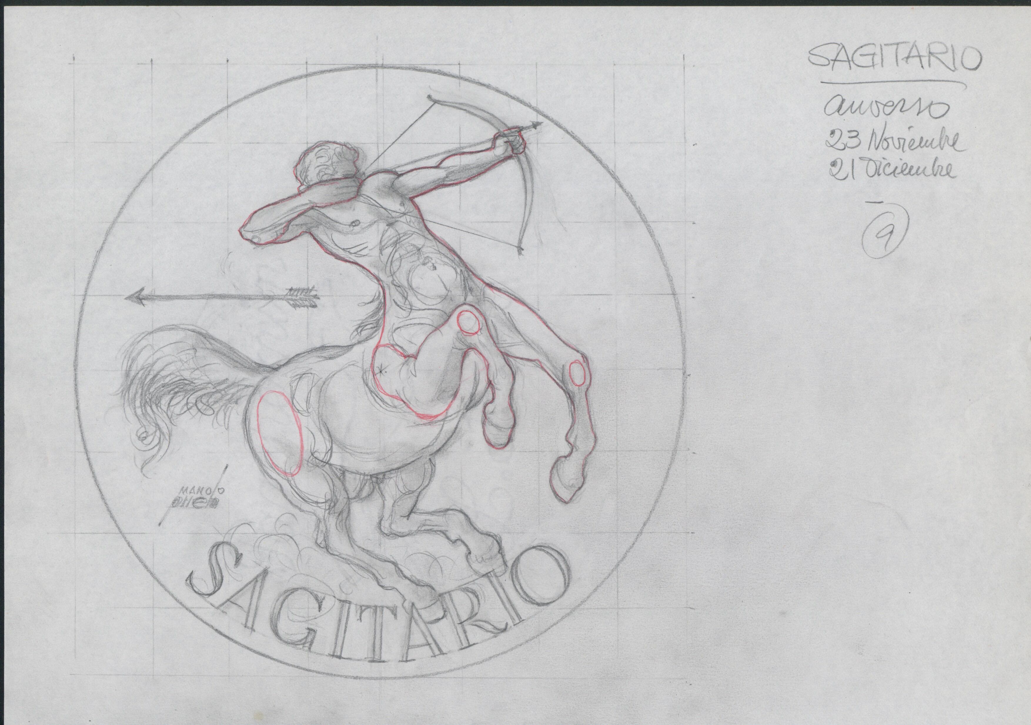 - Boceto a lápiz del anverso de la medalla correspondiente al signo sagitario, representado por un centauro mitad hombre mitad caballo practicando el tiro al arco, junto a la medalla anotaciones a lápiz del autor.