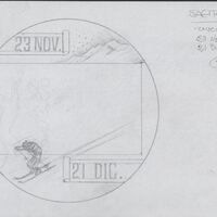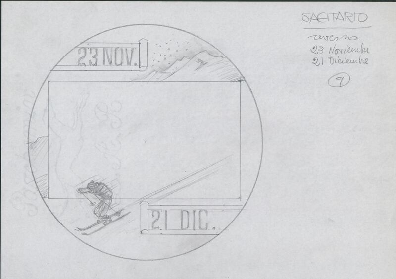- Boceto a lápiz del reverso de la medalla correspondiente al signo sagitario, con las fechas correspondientes al signo y la imagen de un de un esquiador bajando una pista, junto a la medalla anotaciones a lápiz del autor.