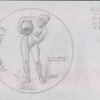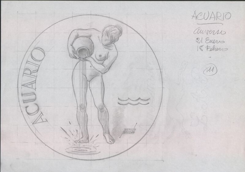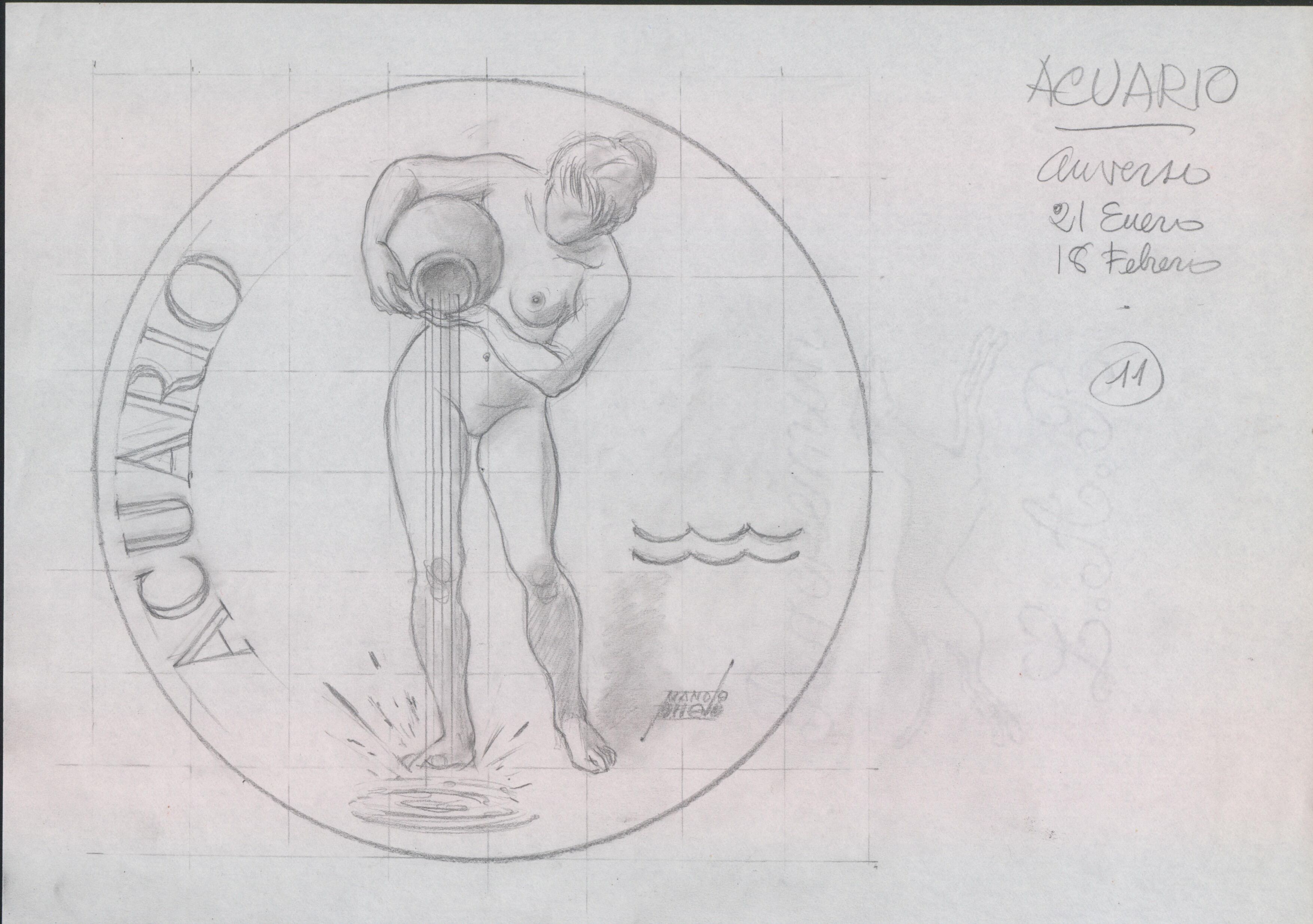 - Boceto a lápiz del anverso de la medalla correspondiente al signo acuario, representado por la imagen de una mujer desnudaron un cántaro de agua que vuelca, junto a la medalla anotaciones a lápiz del autor.