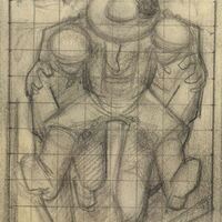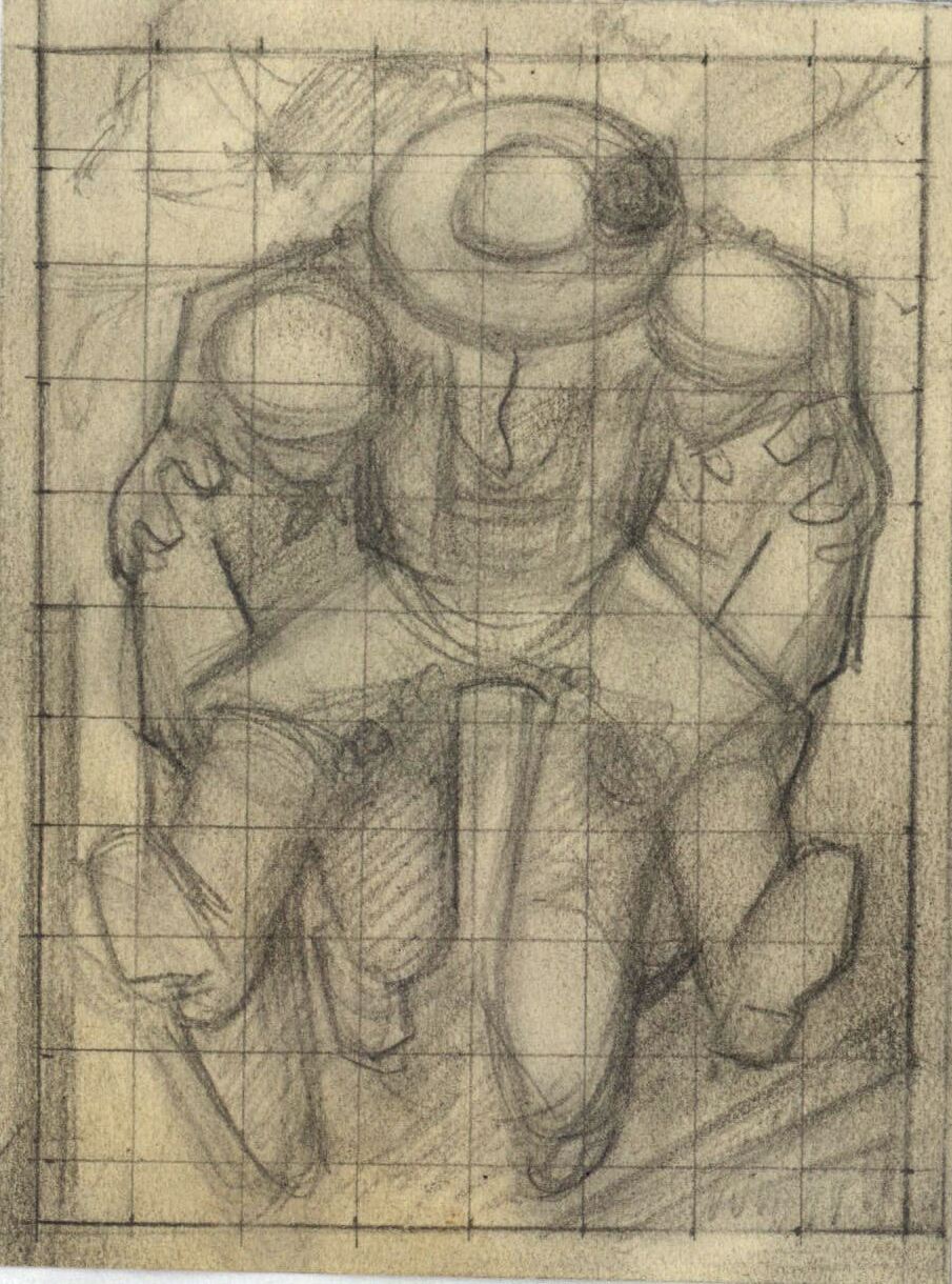 - En una superficie cuadriculada se representa con líneas grises y negras las figuras de dos hombres llevando a un tercero en sus brazos cogido por las piernas. El dibujo está enmarcado.