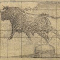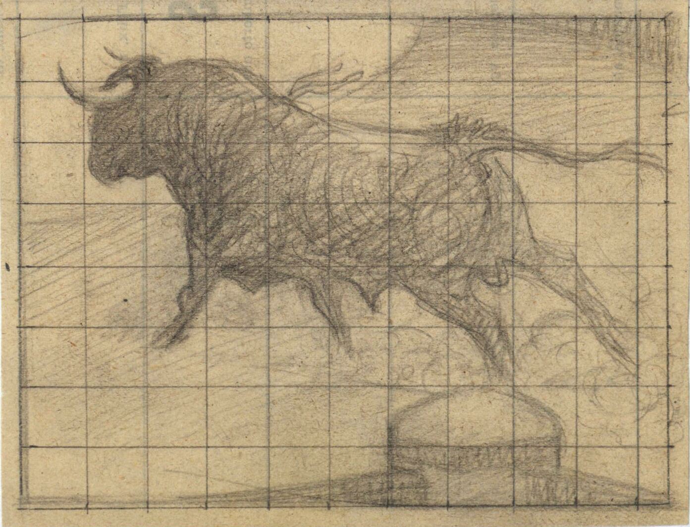 - En esta composición enmarcada y de superficie cuadriculada se ve la imagen de un gran toro negro de espalda en posición de correr. En el mismo dibujo destaca en la parte inferior el sombrero de un hombre. Las líneas predominantes son negras.