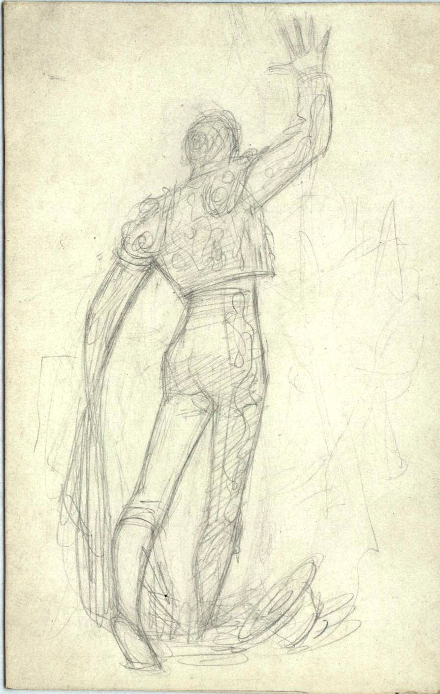 - Como tema principal se ha dibujado en esta composición la figura estilizada de un torero de espalda con su traje de luces. Su brazo derecho lo levanta hacia arriba mientras que su brazo izquierdo sostiene la capa.
