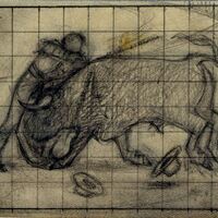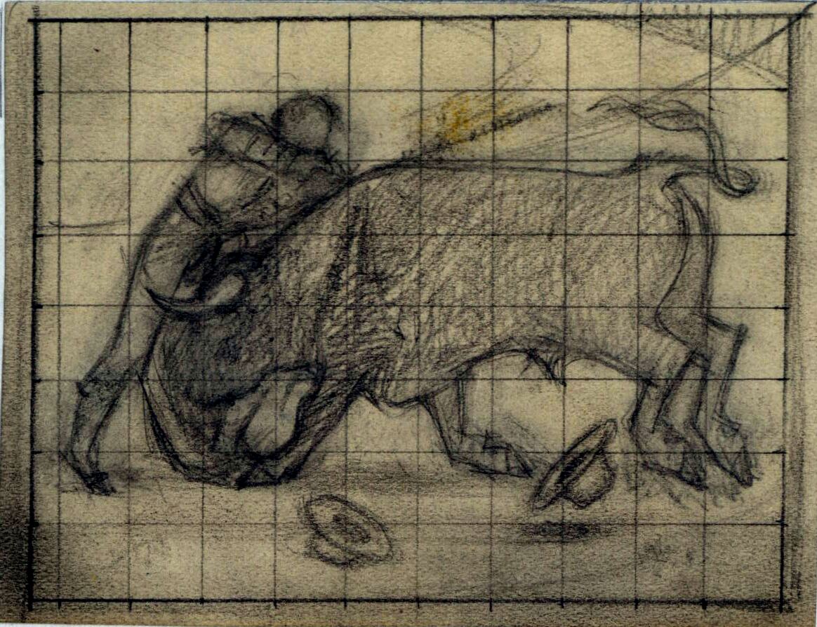 - Sobre un fondo oscuro y predominando las líneas en tonos también oscuros se vislumbra la imagen de un toro de espalda invistiendo al torero que se defiende con valentía clavándole su espada. En sus manos sostiene la espada y la capa. Caído en el suelo hay dos sombreros. La superficie del dibujo enmarcado es cuadriculada.