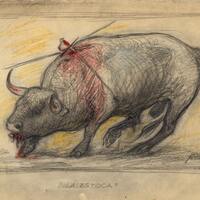 - El toro ocupa toda la escena perfectamente centrada y encuadrada, recogiendo el momento concreto del desplome del toro, destacan los colores amarillo como toques de luz entorno a la figura del toro, y los elementos en rojo.