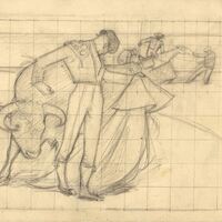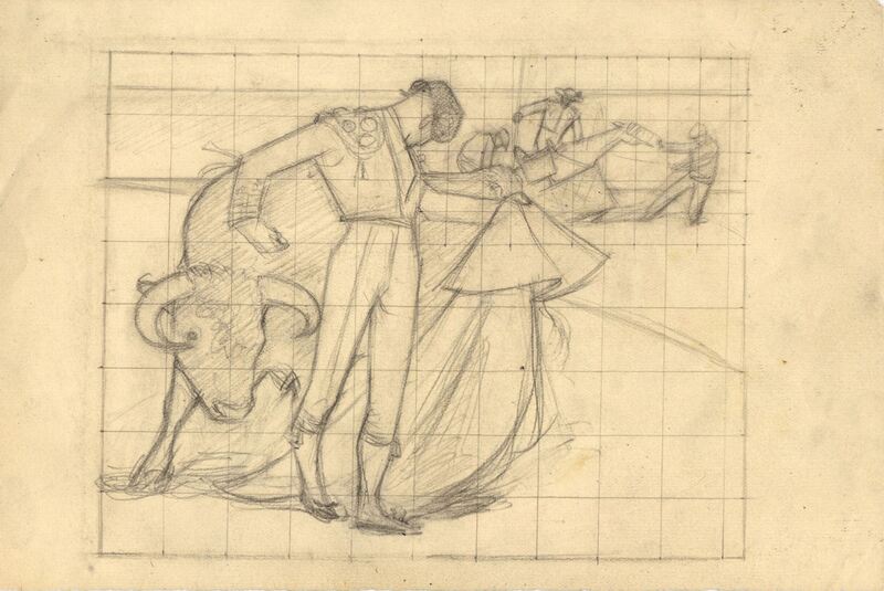 - En el dibujo destaca la figura estilizada de un torero con su cuerpo contorneado elegantemente toreando al toro negro que se ve detrás de su imagen. En un segundo plano se ven las figuras de dos toreros. La escena se halla enmarcada y en una superficie cuadriculada.