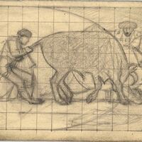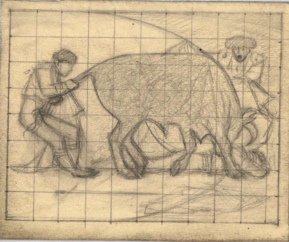 - En este dibujo enmarcado y con la superficie cuadriculada se vislumbra la imagen de un toro de perfil al que dos toreros, uno por detrás cogiéndole por el rabo y otro por delante con la capa, intentan dominar al animal. Sobre un fondo amarillento destacan los colores grisáceos.
