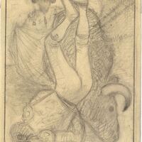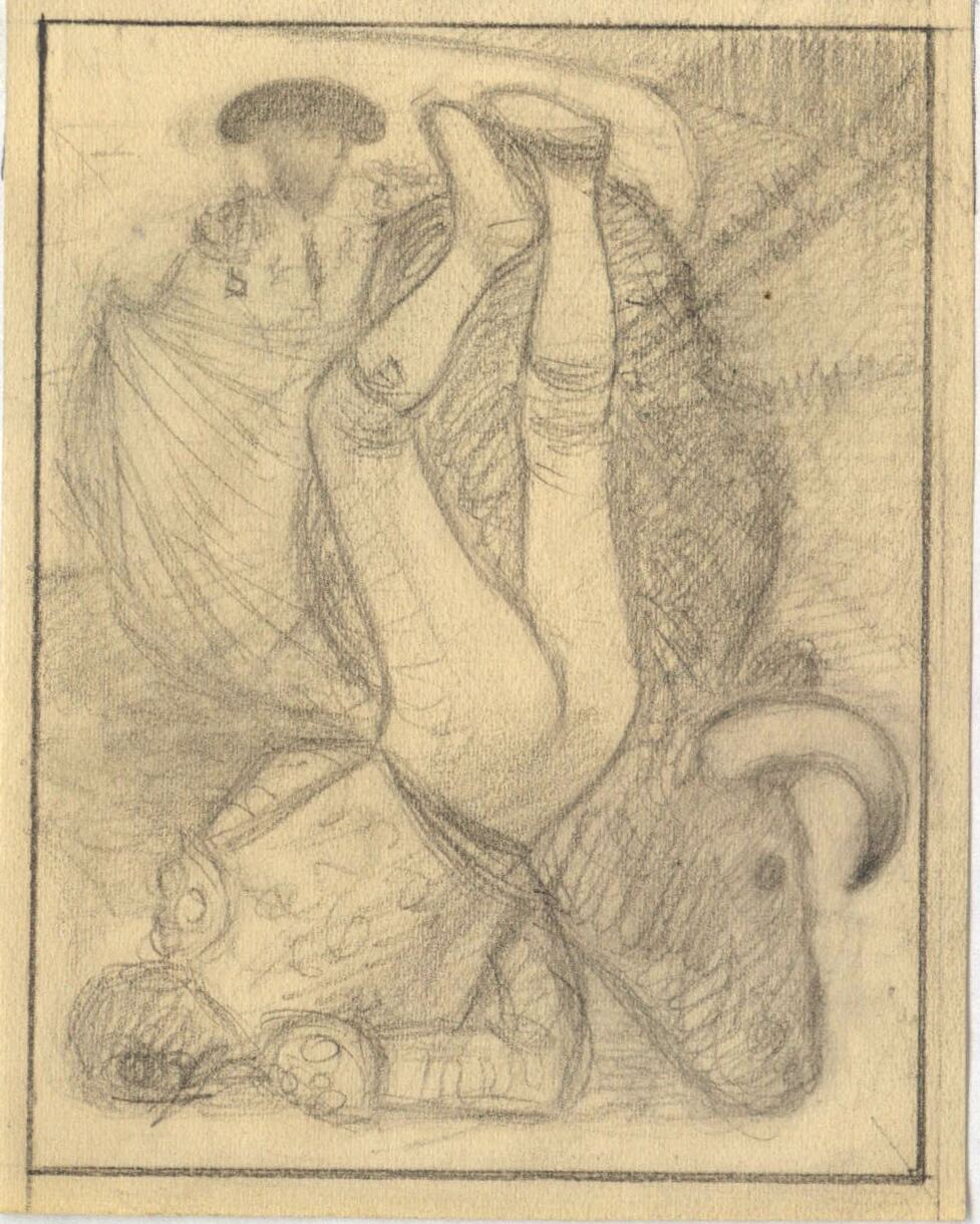 - En el dibujo enmarcado donde predominan las líneas grisáceas un toro coge a un torero que vuela por los aires, así como se puede apreciar en primer término. Detrás de la figura del animal destaca un torero con su capa dispuesto a desviar la atención del toro.